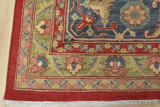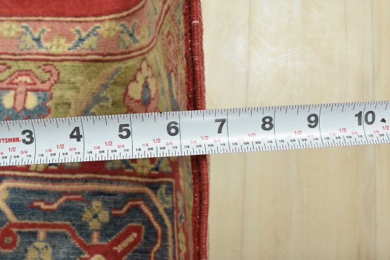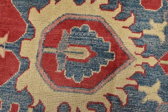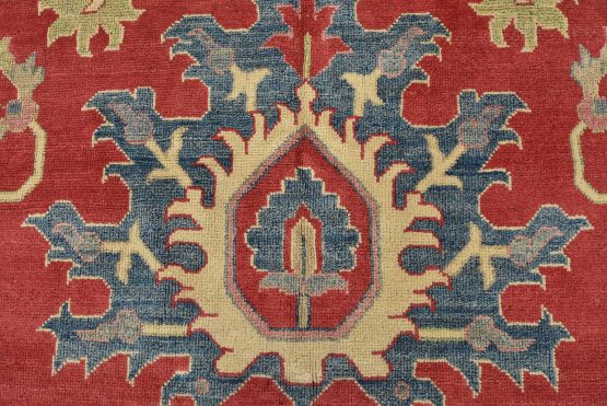 A traditional Caucasian Kazak rug hand-knotted with an all-wool pile on a cotton foundation. This oriental rug features a central geometric medallion surrounded by a botanical design set against a red background. It is new and in excellent condition.