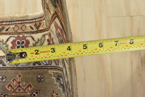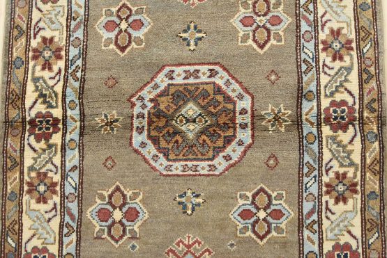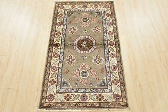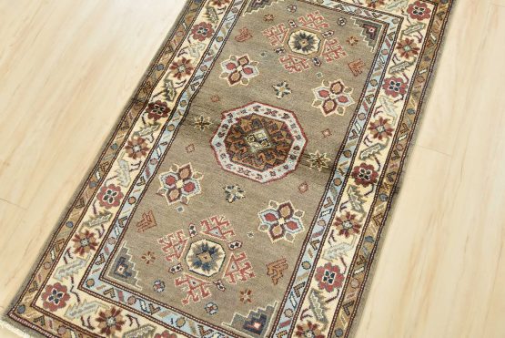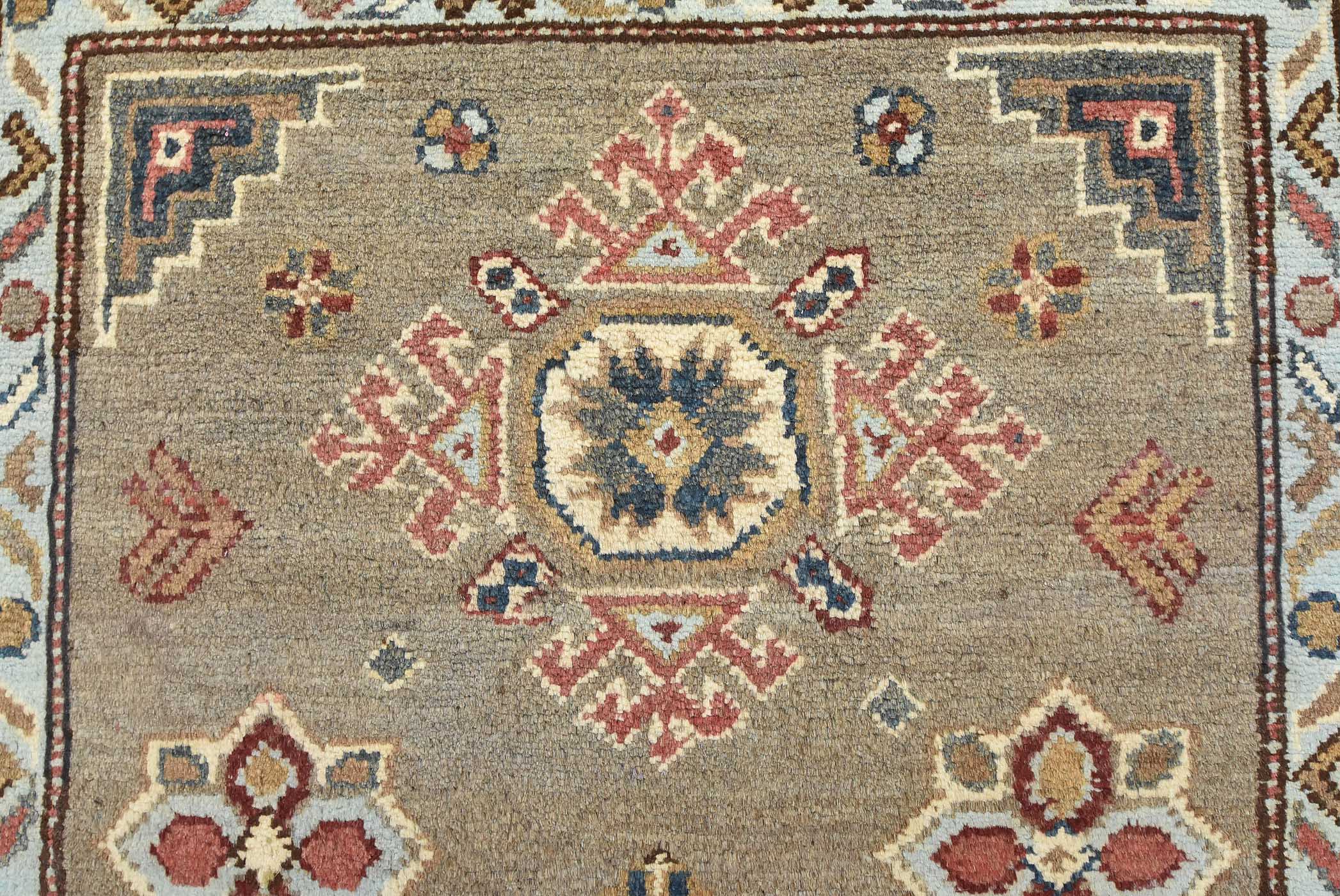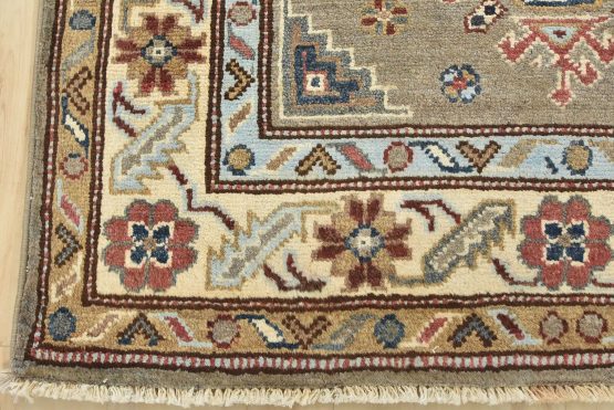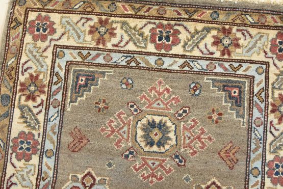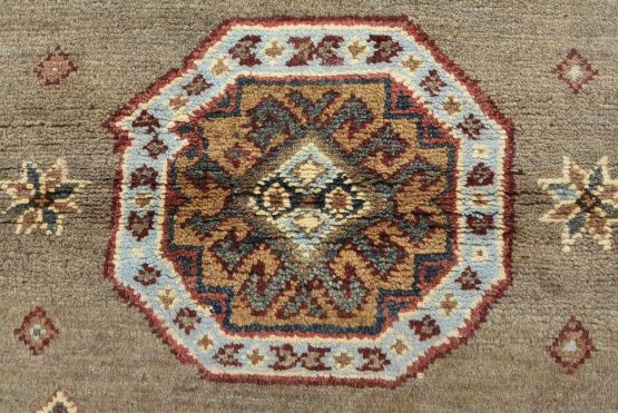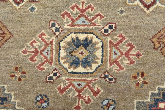 A tribal Caucasian Kazak rug hand-knotted with an all-wool pile on a cotton foundation. This oriental rug features a central medallion surrounded by geometric motifs set against a brown background. It is new and in excellent condition.