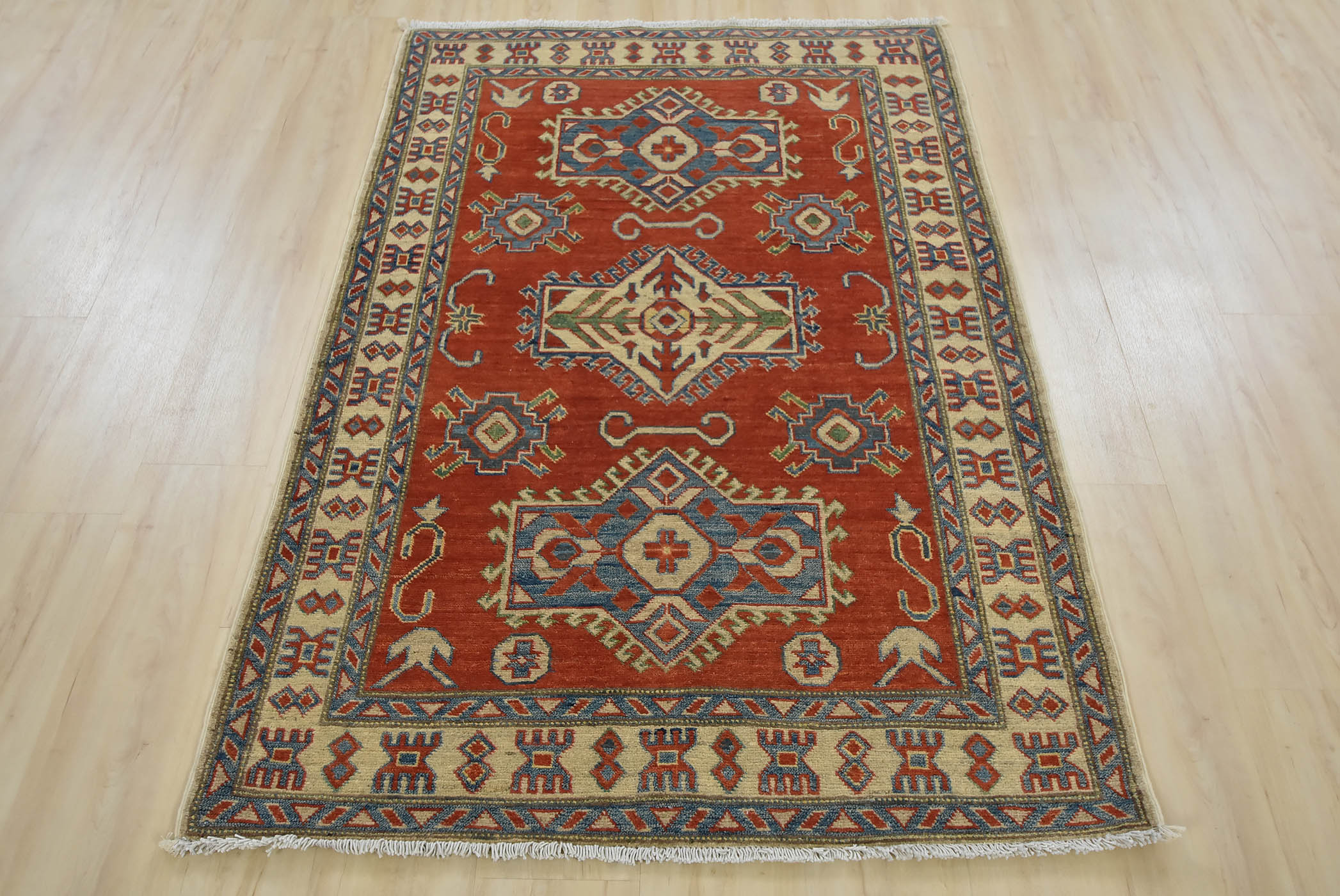 A tribal Caucasian Kazak rug hand-knotted with an all-wool pile on a cotton foundation. This oriental rug features geometric medallions surrounded by geometric motifs set against a red background. It is new and in excellent condition.