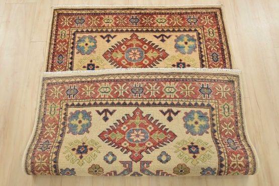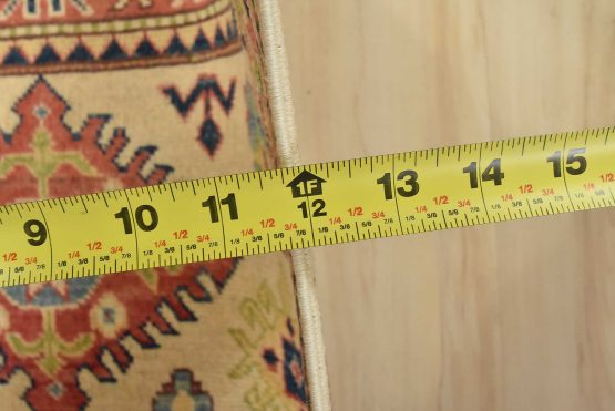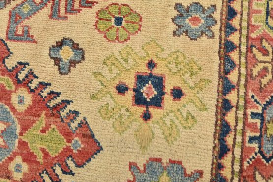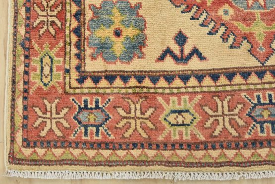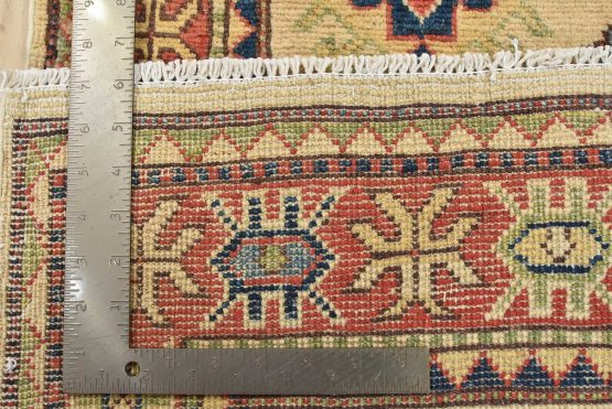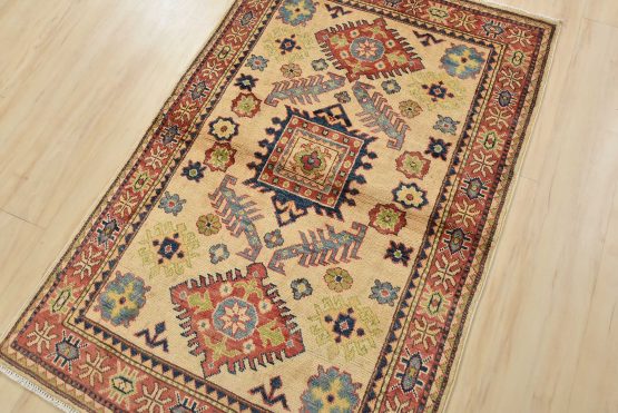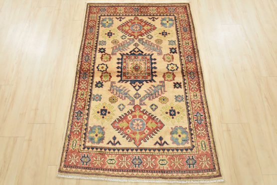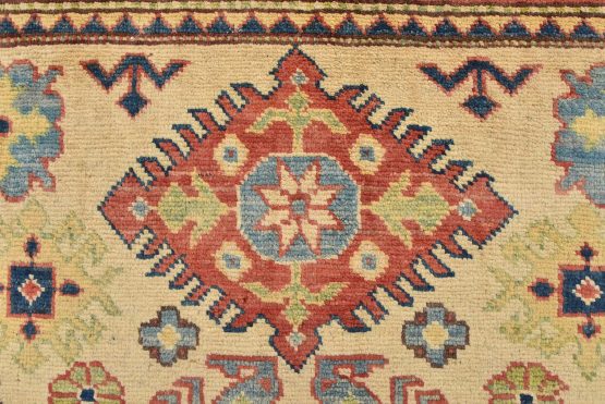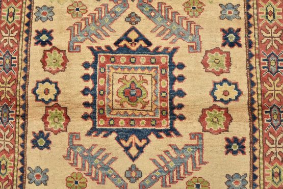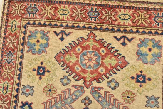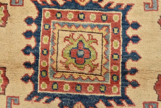A tribal Caucasian Kazak rug hand-knotted with an all-wool pile on a cotton foundation. This oriental rug features three geometric medallions surrounded by geometric motifs set against a beige background. It is new and in excellent condition.