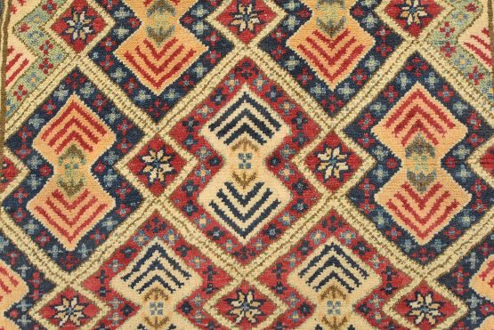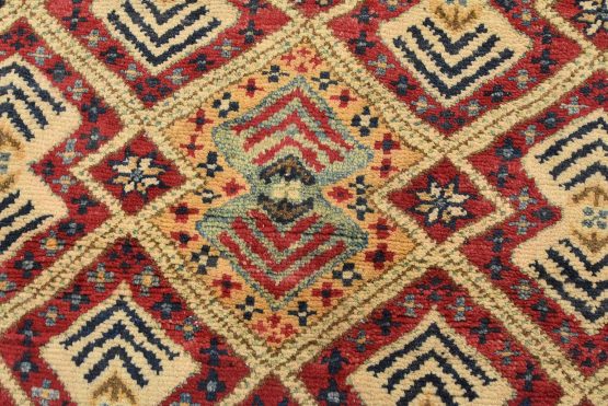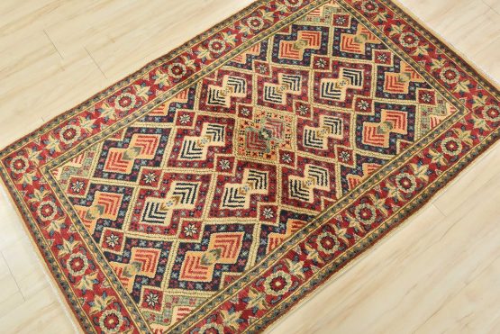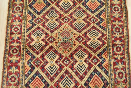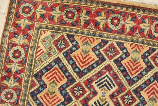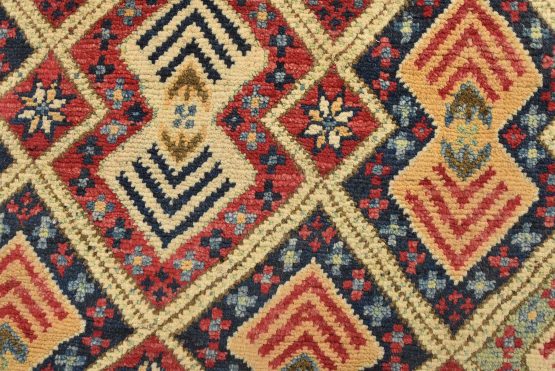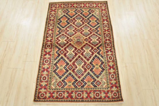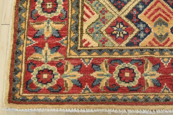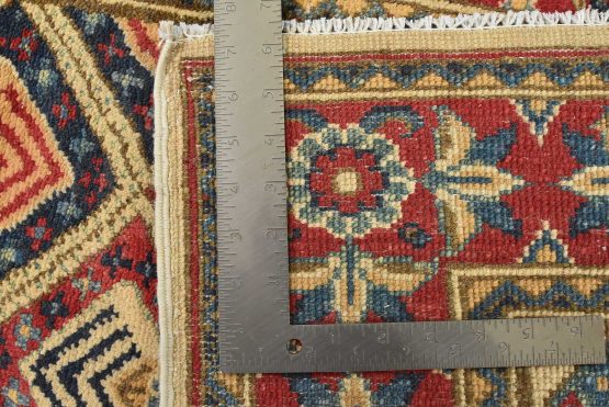 A tribal Caucasian Kazak rug hand-knotted with an all-wool pile on a cotton foundation. This oriental rug features an all-over geometric pattern. It is new and in excellent condition.