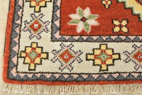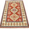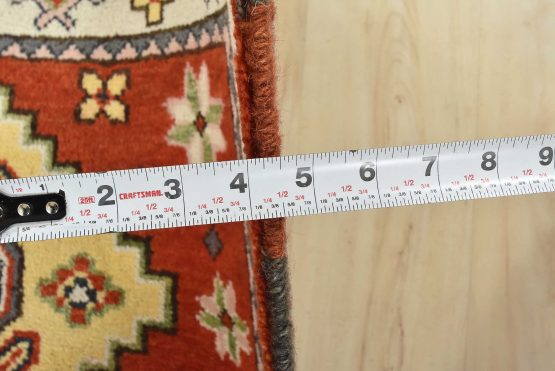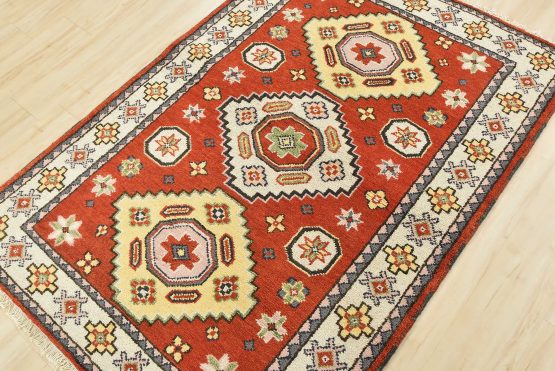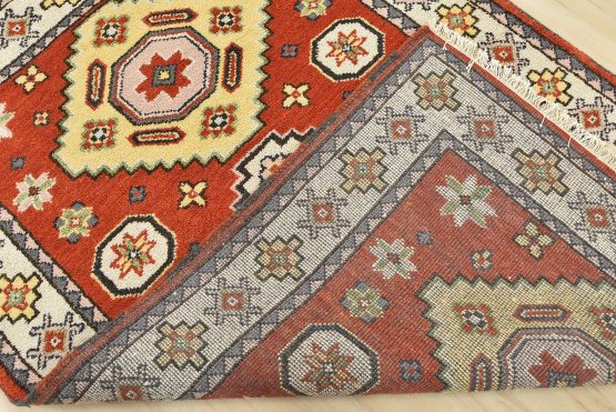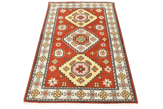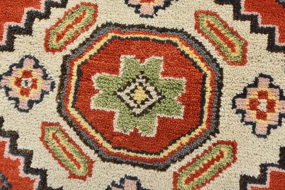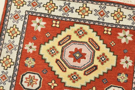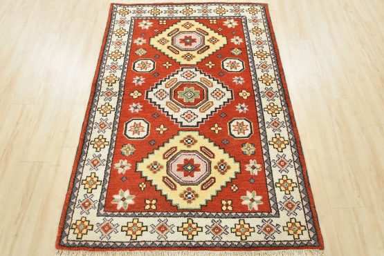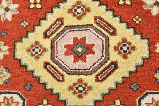 A tribal Caucasian Kazak rug hand-knotted with an all-wool pile on a cotton foundation. This oriental rug features geometric medallions surrounded by small geometric motifs set against an orange background. It is new and in excellent condition.