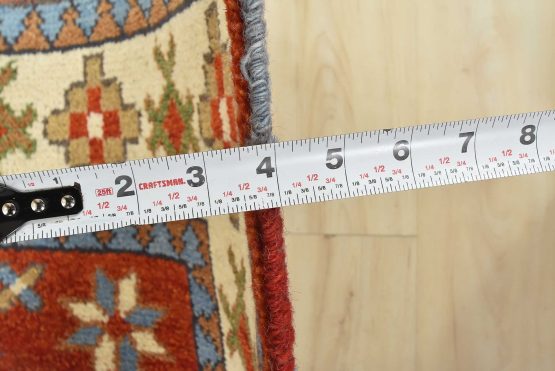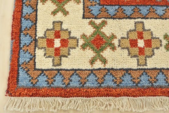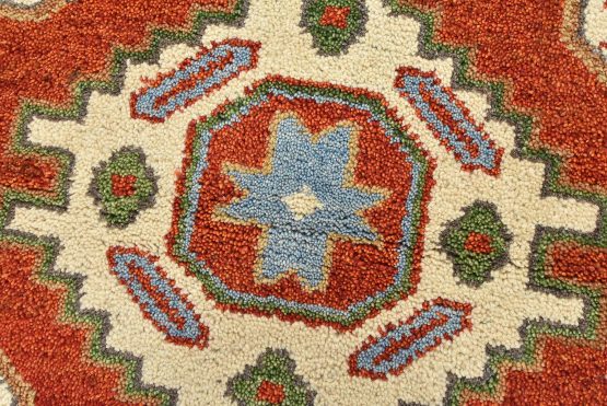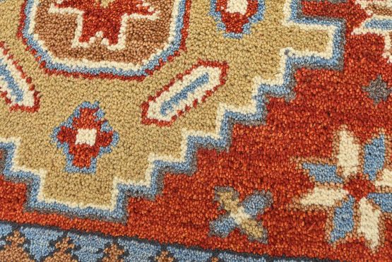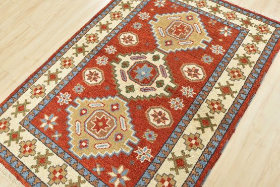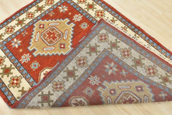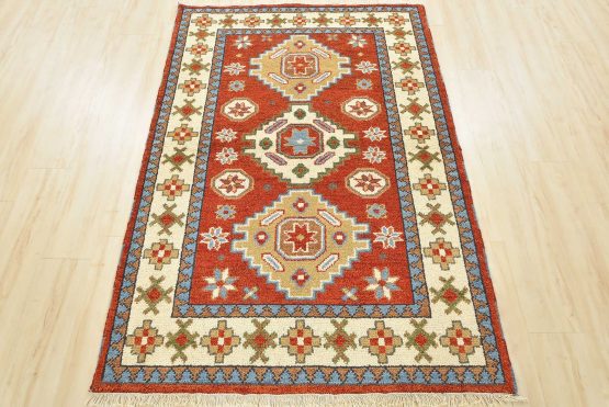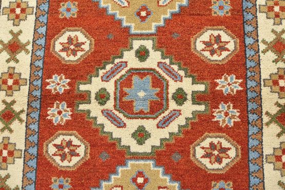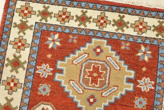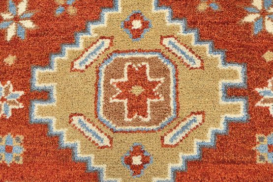 A tribal Caucasian Kazak rug hand-knotted with an all-wool pile on a cotton foundation. This oriental rug features geometric medallions surrounded by small geometric motifs set against an orange background. It is new and in excellent condition.