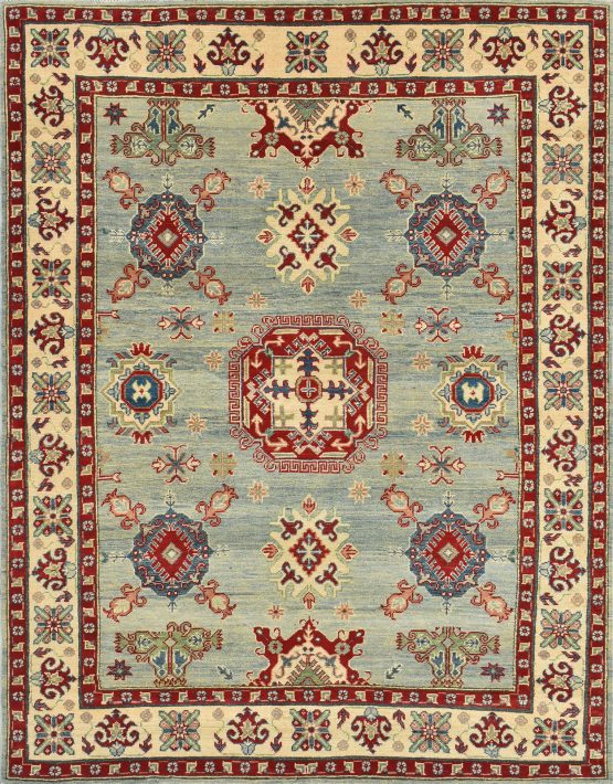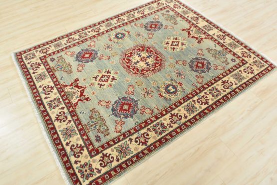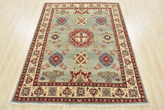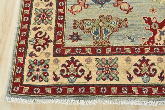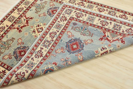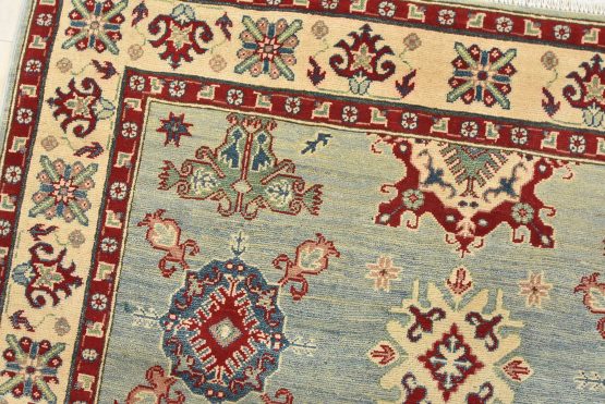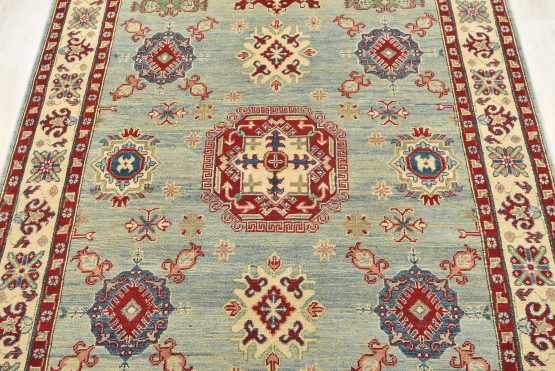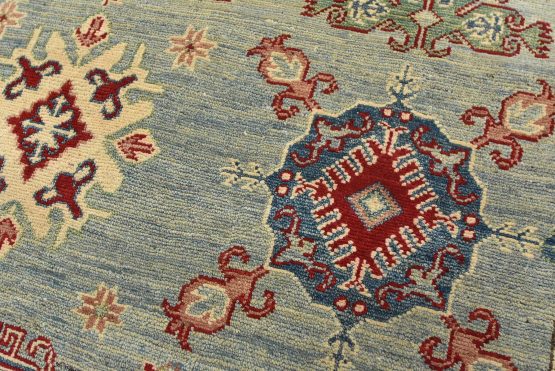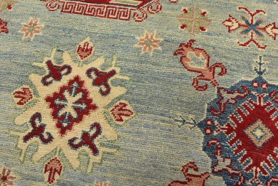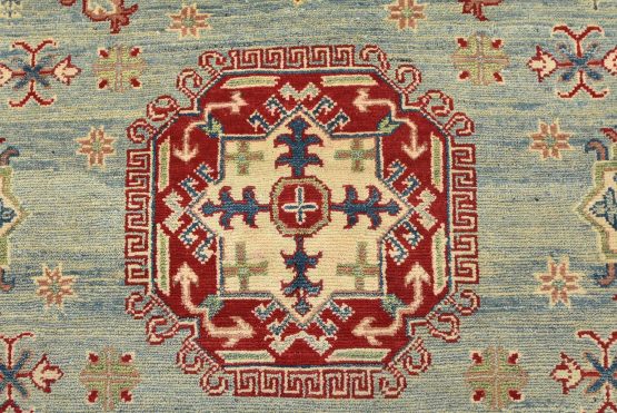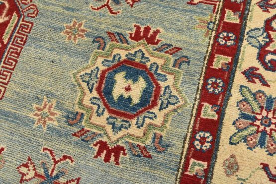 A traditional tribal Caucasian Kazak rug hand-knotted with an all-wool pile on a cotton foundation. This oriental rug features a central geometric medallion surrounded by geometric motifs set against a blue background. It is new and in excellent condition.