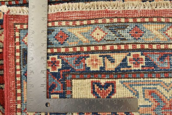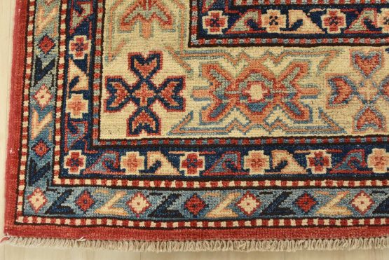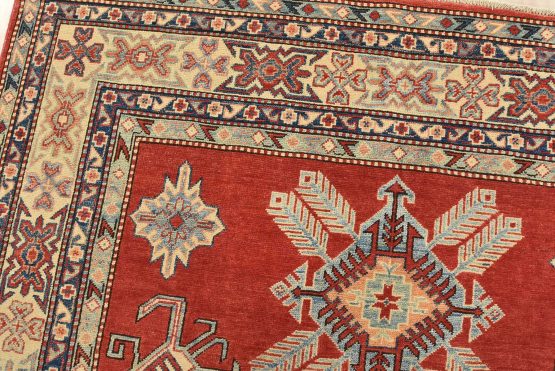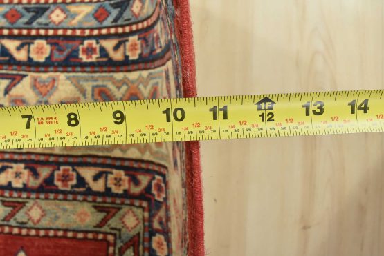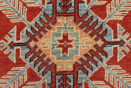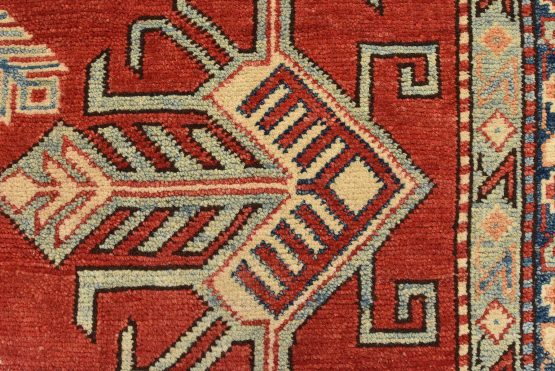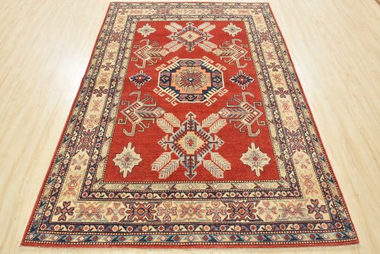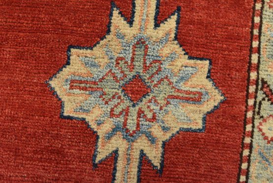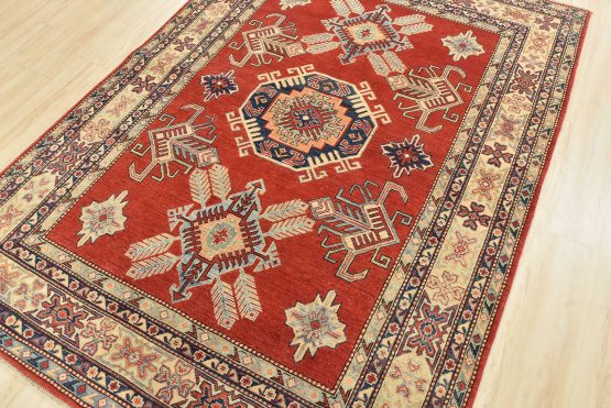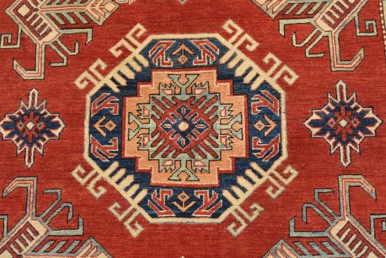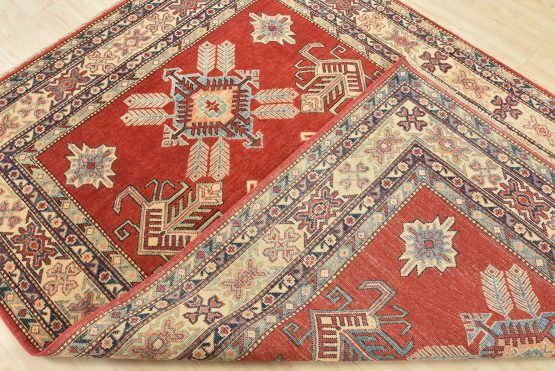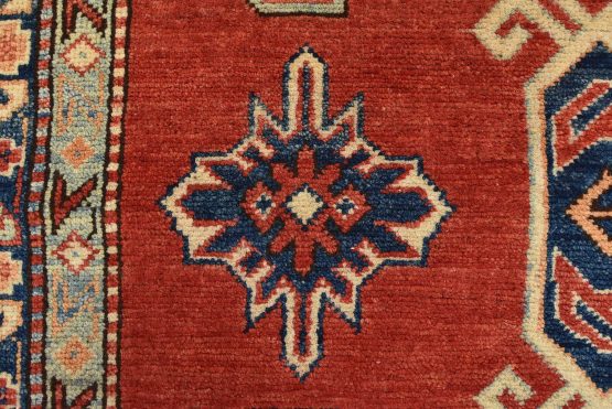 A tribal Caucasian Kazak rug hand-knotted with an all-wool pile on a cotton foundation. This oriental rug features geometric medallions surrounded by geometric motifs set against a red background. It is new and in excellent condition.