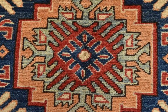 Original antique Kazak rugs from the Caucasus region inspire the creation of new Kazak rugs. These rugs are woven with fine wool using traditional Kazak patterns and finished with a low-cut pile, giving them an authentic vintage look.