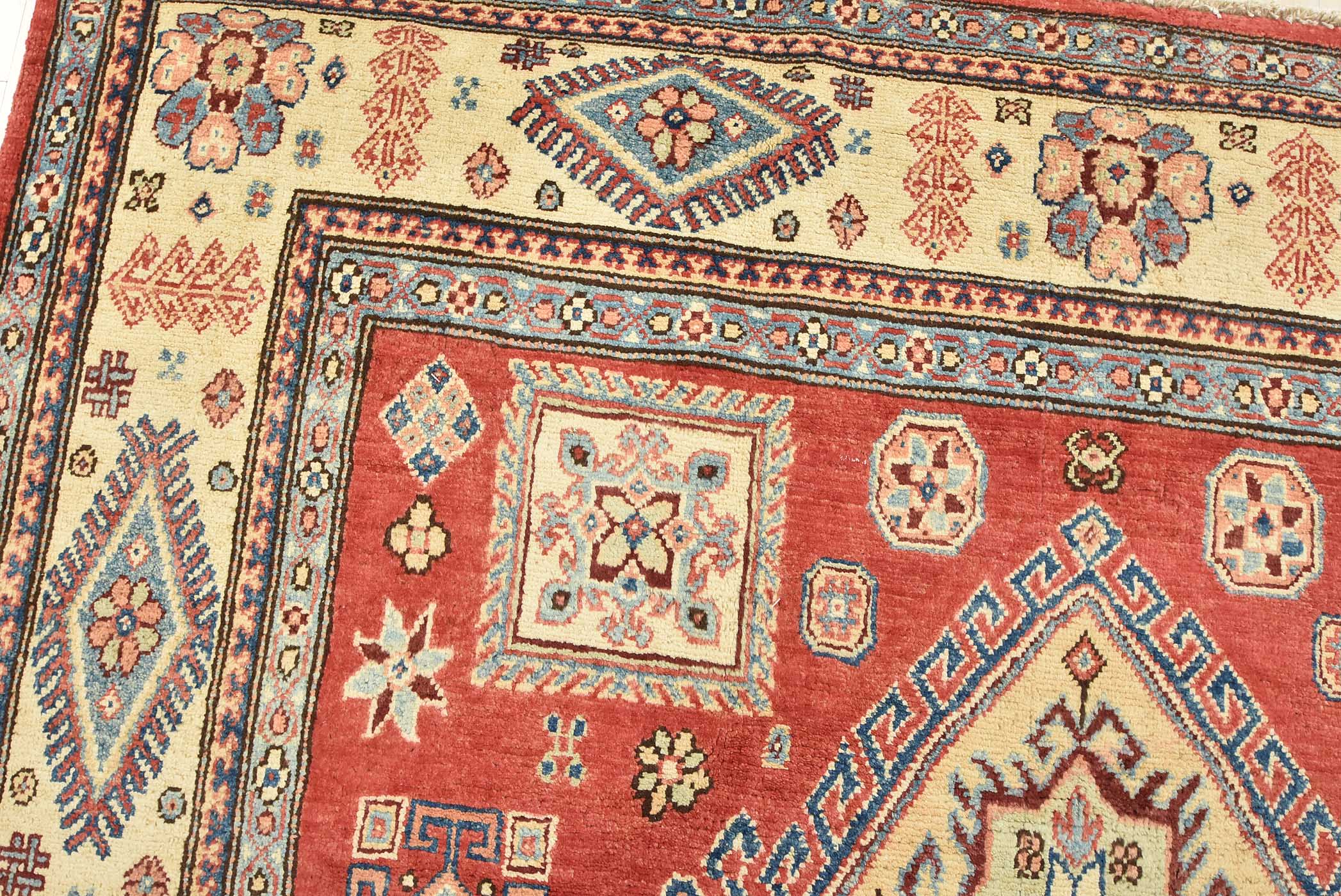 A tribal Caucasian Kazak rug hand-knotted with an all-wool pile on a cotton foundation. This oriental rug features geometric medallions surrounded by geometric motifs set against a red background. It is new and in excellent condition.