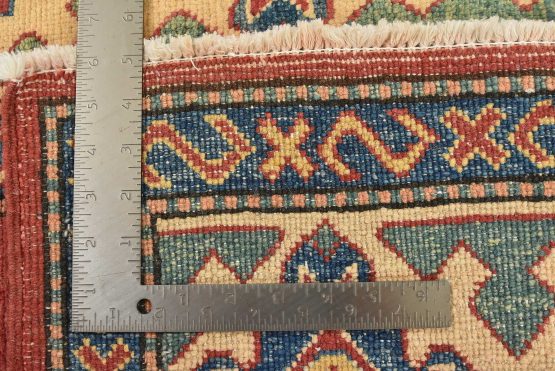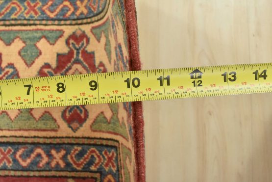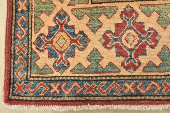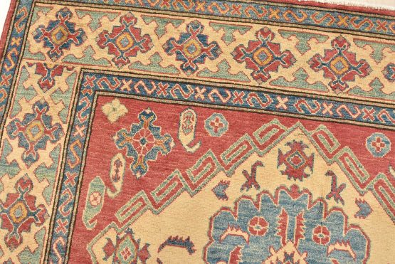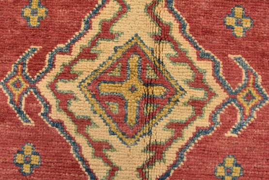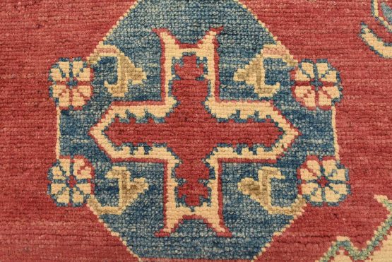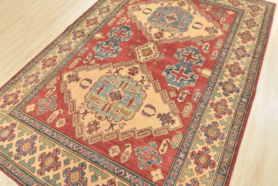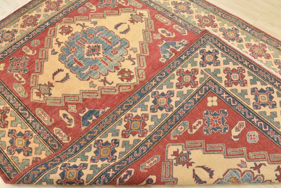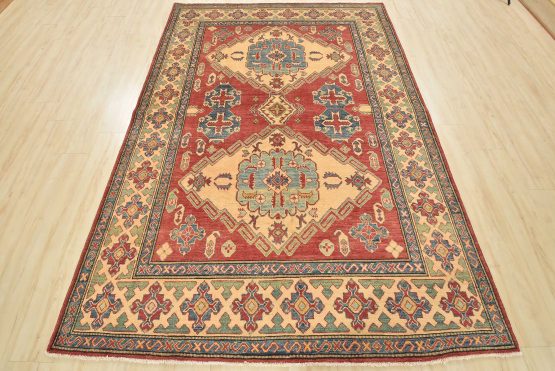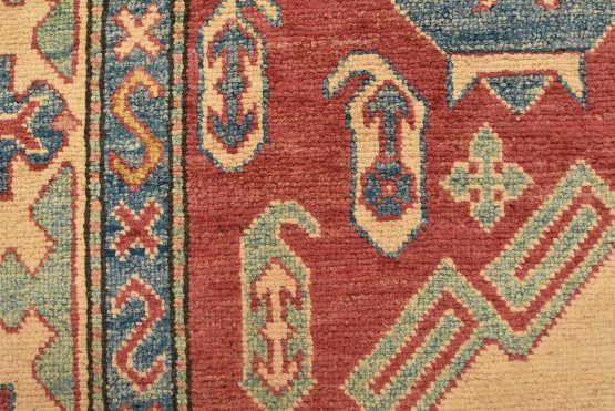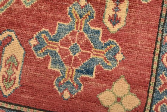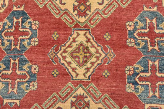 A tribal Caucasian Kazak rug hand-knotted with an all-wool pile on a cotton foundation. This oriental rug features geometric medallions surrounded by geometric motifs set against a red background. It is new and in excellent condition.
