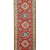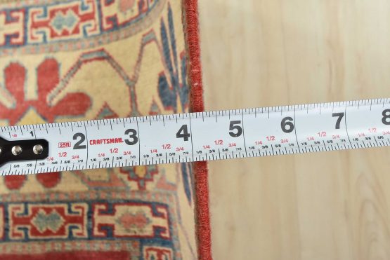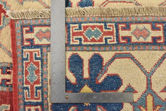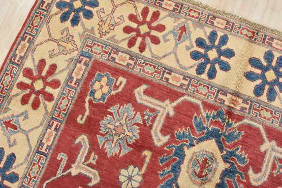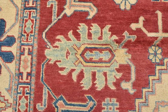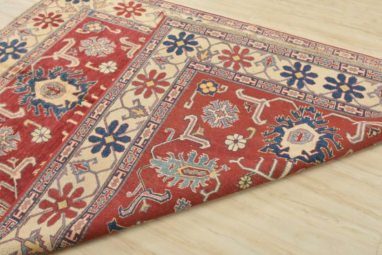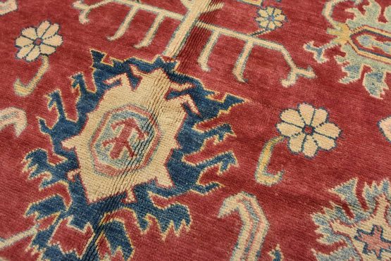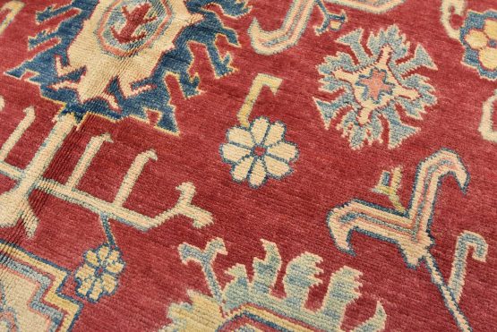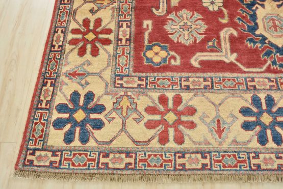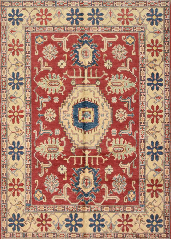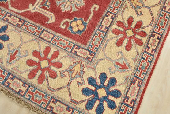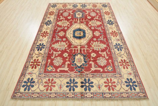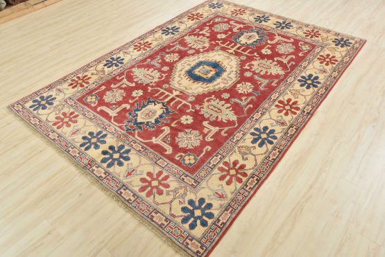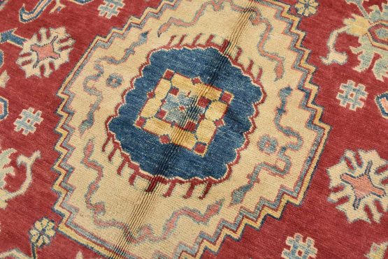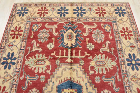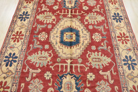 A traditional tribal Caucasian Kazak rug hand-knotted with an all-wool pile on a cotton foundation. This oriental rug features a central geometric medallion surrounded by botanical motifs set against a red background. It is new and in excellent condition.