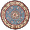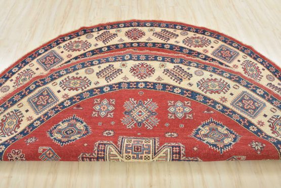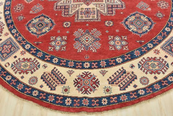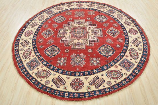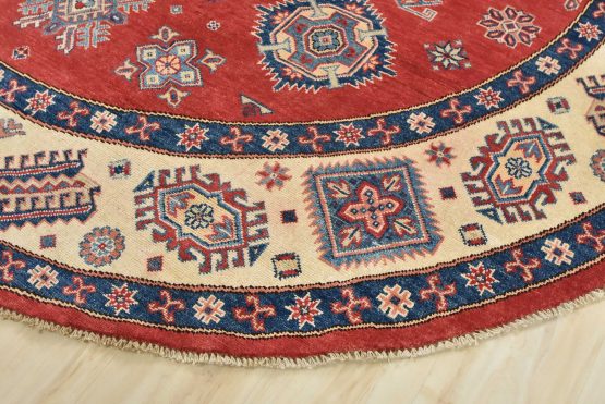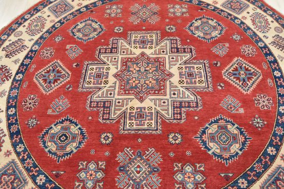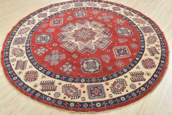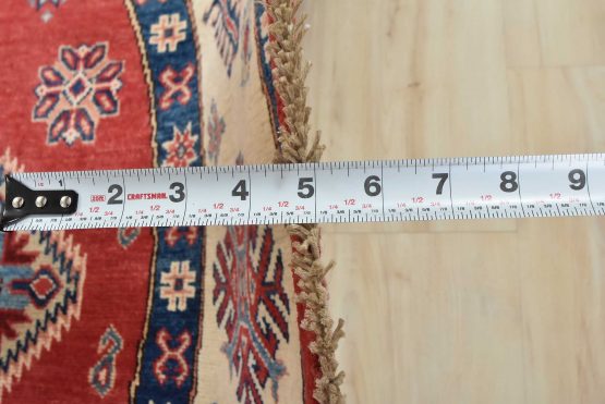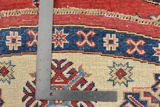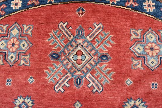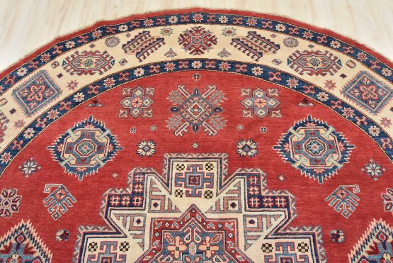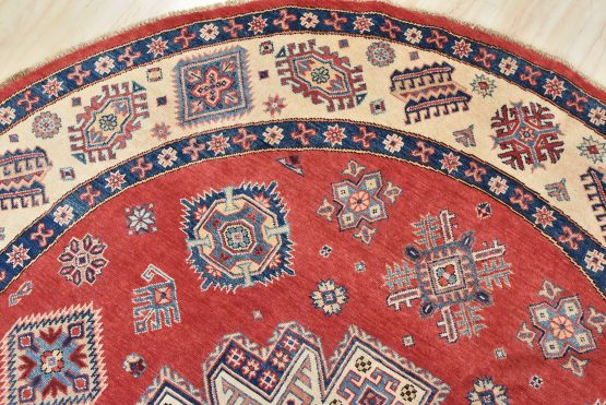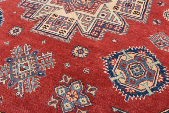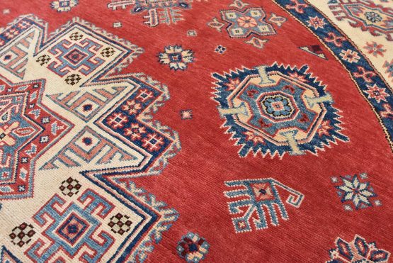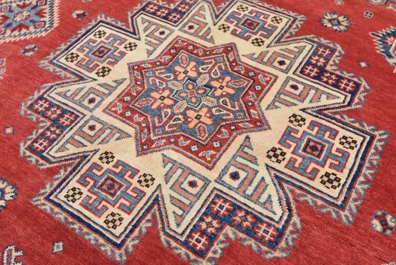 A tribal Caucasian Kazak rug hand-knotted with an all-wool pile on a cotton foundation. This oriental rug features a central geometric medallion surrounded by geometric motifs set against a red background. It is new and in excellent condition.