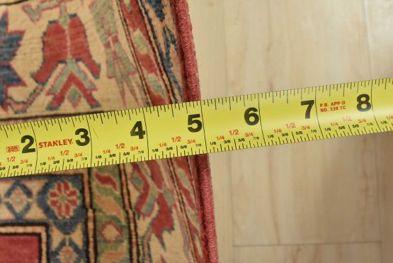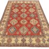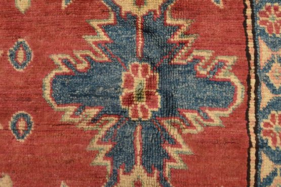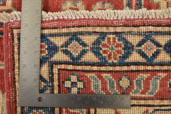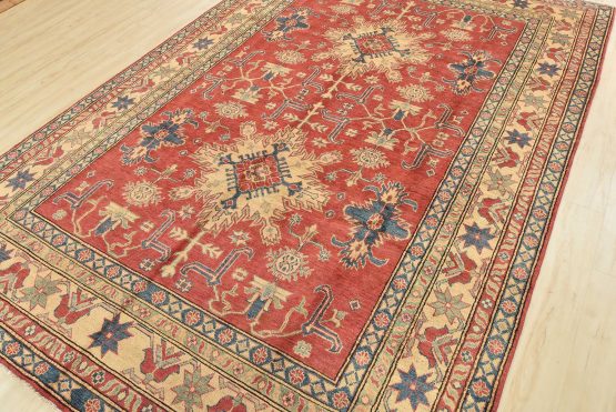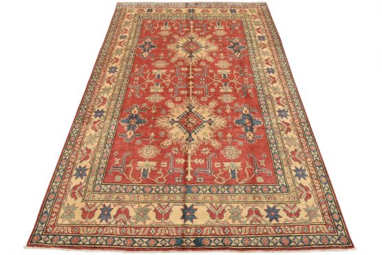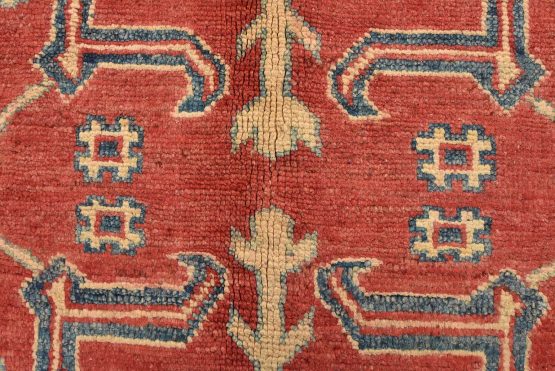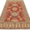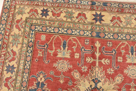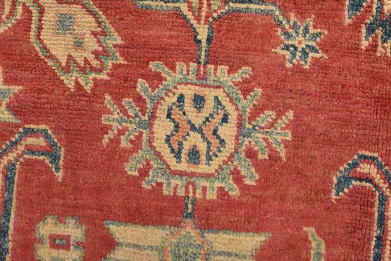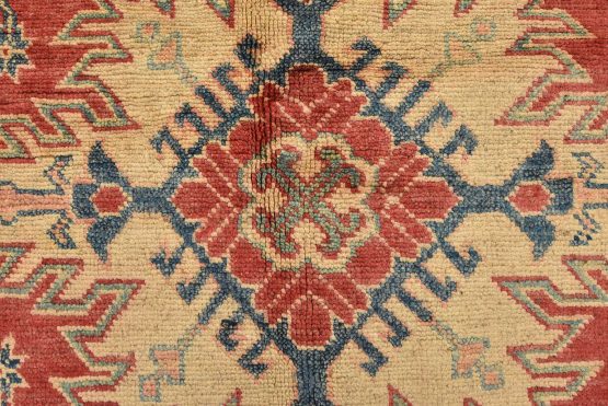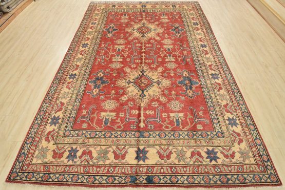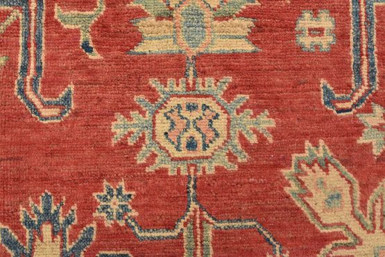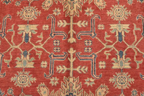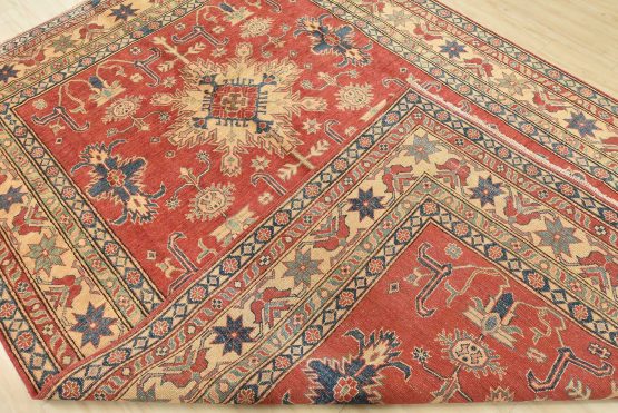 A tribal Caucasian Kazak rug hand-knotted with an all-wool pile on a cotton foundation. This oriental rug features geometric medallions surrounded by a geometric botanical design set against a red background. It is new and in excellent condition.