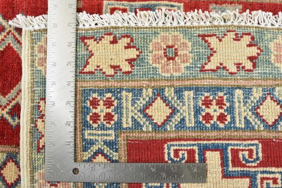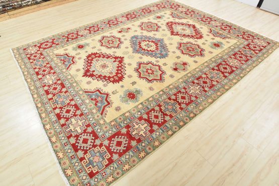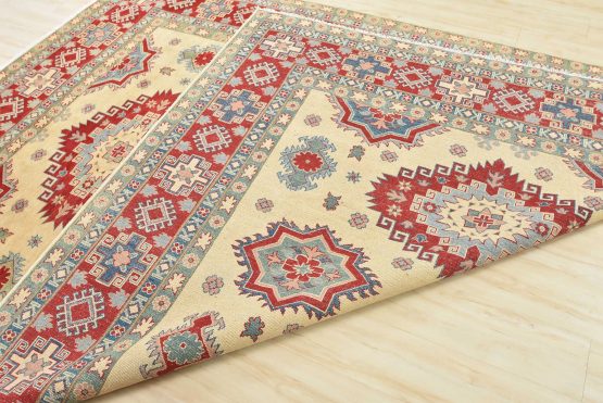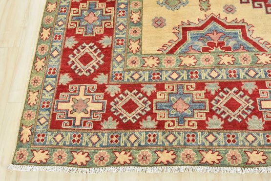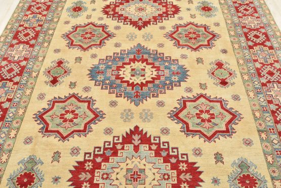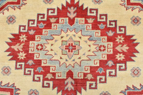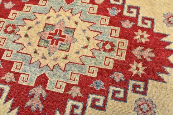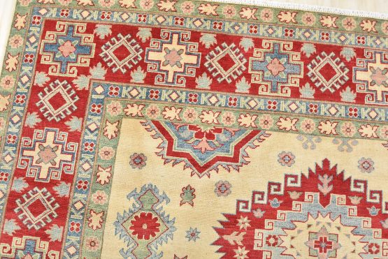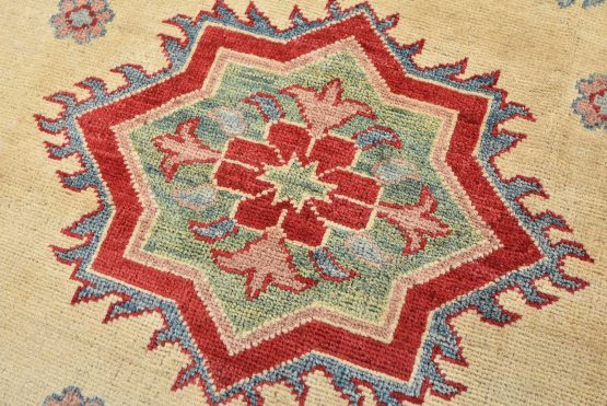 A tribal Caucasian Kazak rug hand-knotted with an all-wool pile on a cotton foundation. This oriental rug features geometric medallions surrounded by geometric motifs set against a beige background. It is new and in excellent condition.