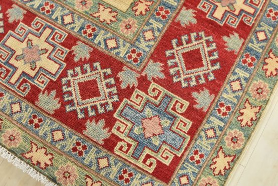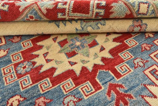 Original antique Kazak rugs from the Caucasus region inspire the creation of new Kazak rugs. These rugs are woven with fine wool using traditional Kazak patterns and finished with a low-cut pile, giving them an authentic vintage look.
