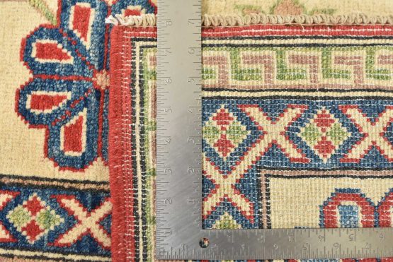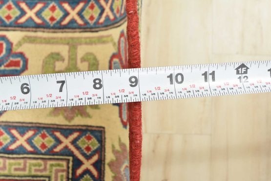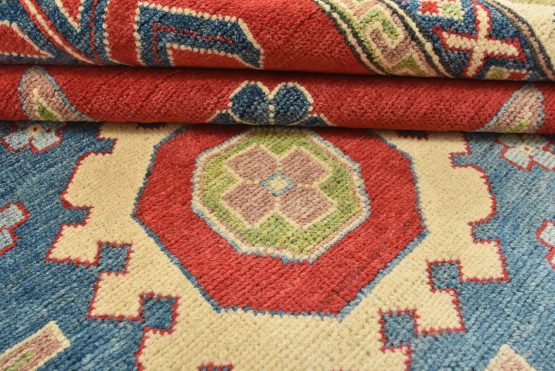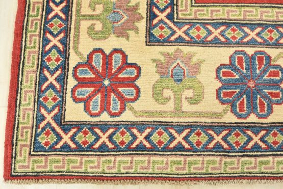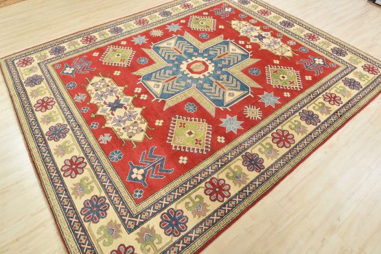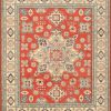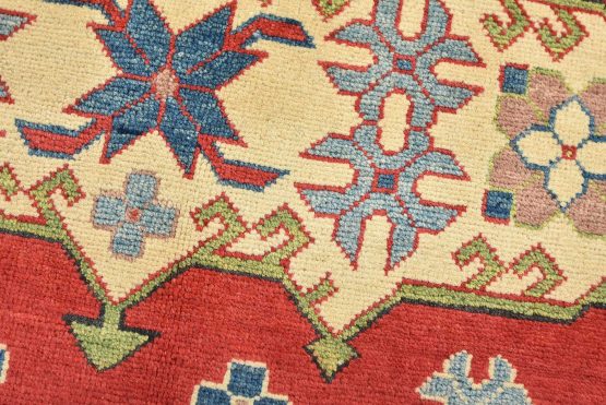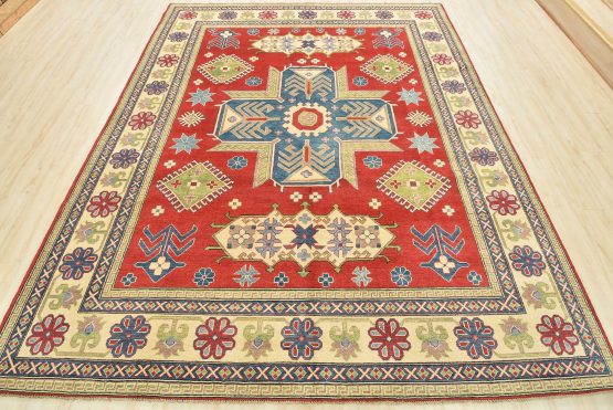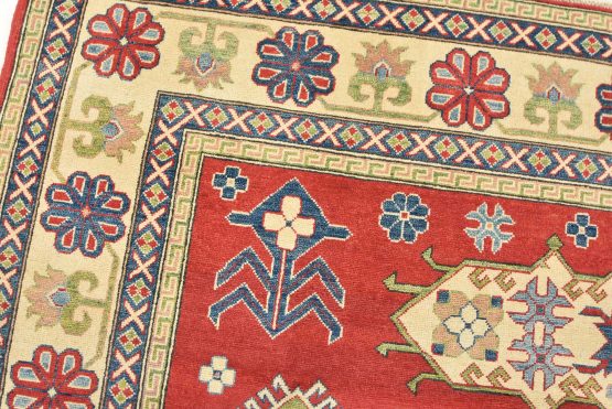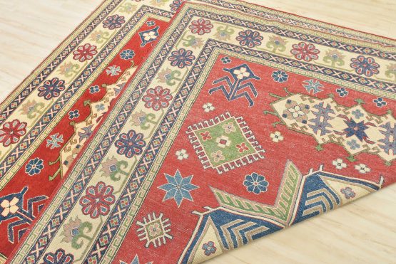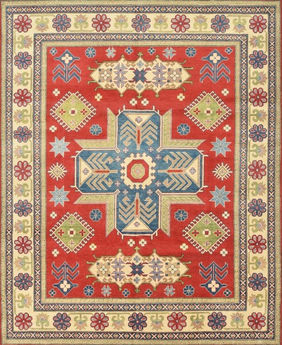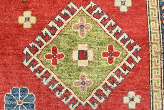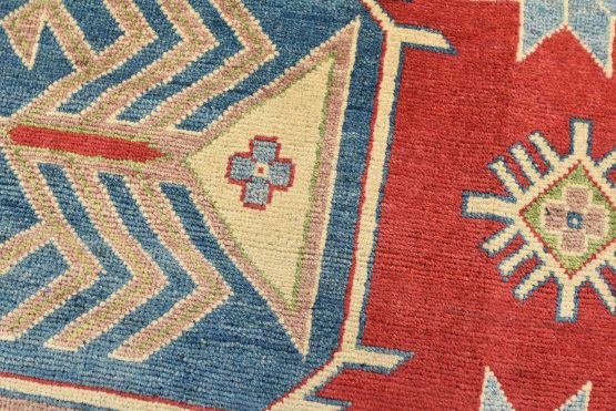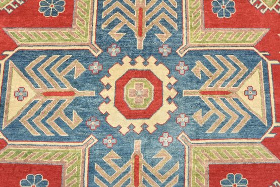 A tribal Caucasian Kazak rug hand-knotted with an all-wool pile on a cotton foundation. This oriental rug features a central geometric medallion surrounded by geometric motifs set against a red background. It is new and in excellent condition.