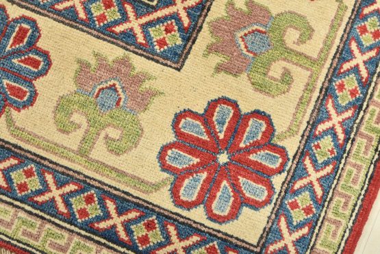 Original antique Kazak rugs from the Caucasus region inspire the creation of new Kazak rugs. These rugs are woven with fine wool using traditional Kazak patterns and finished with a low-cut pile to give them an authentic vintage look.