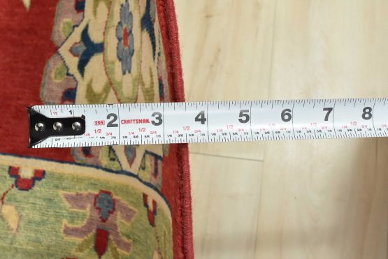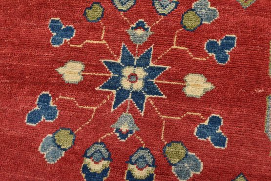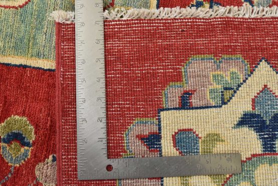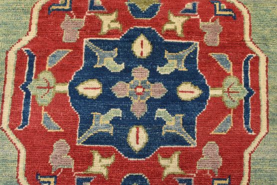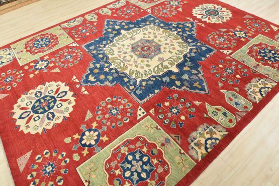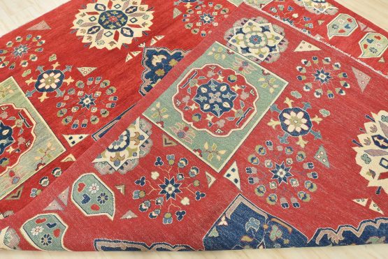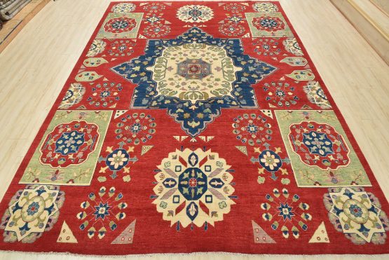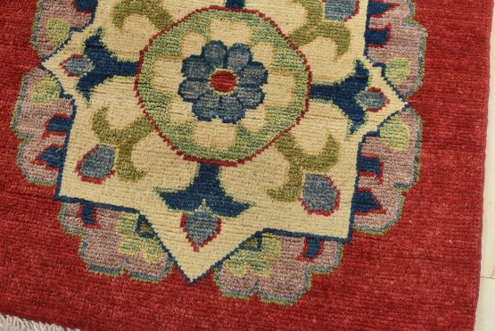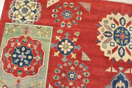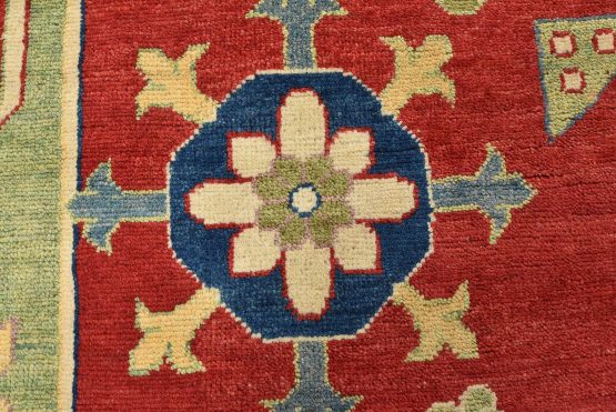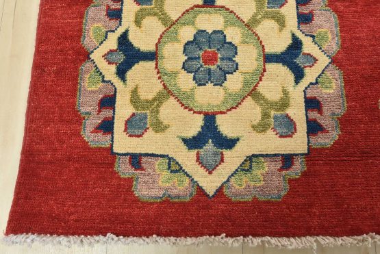 A traditional Caucasian Kazak rug hand-knotted with an all-wool pile on a cotton foundation. This oriental rug features a central geometric medallion surrounded by geometric-style botanical motifs set against a red background. It is new and in excellent condition.