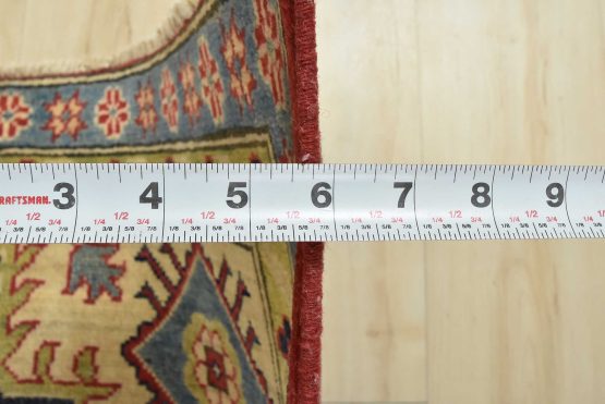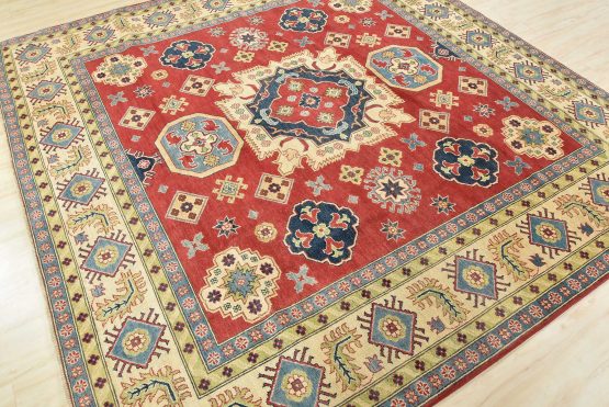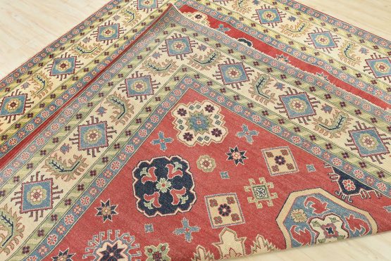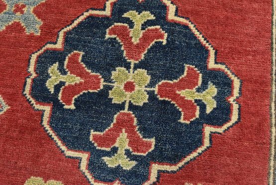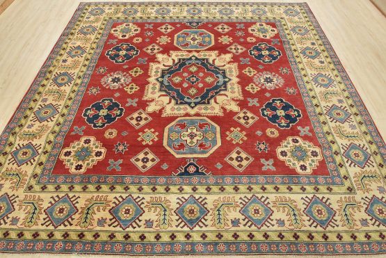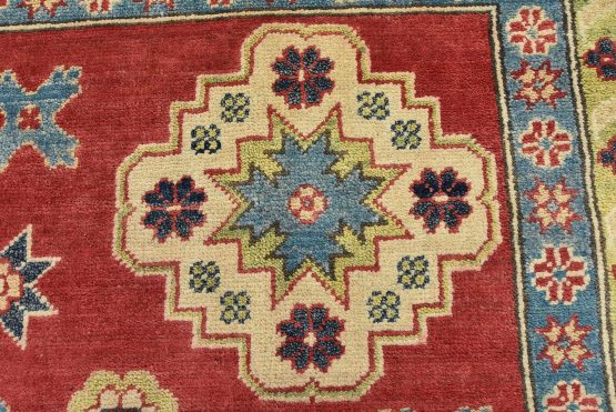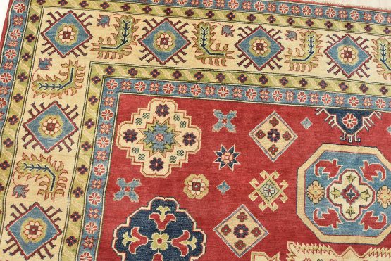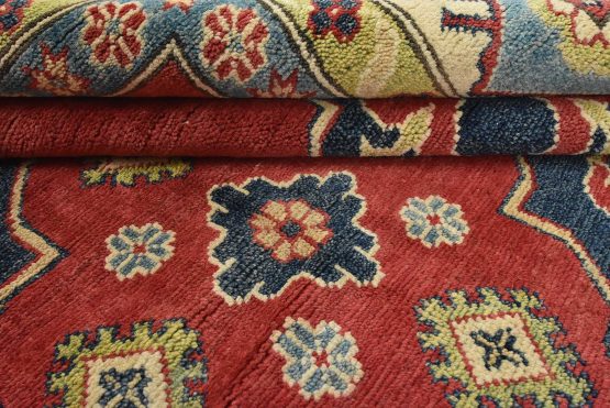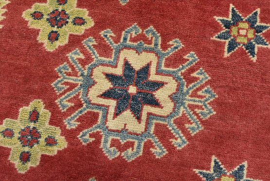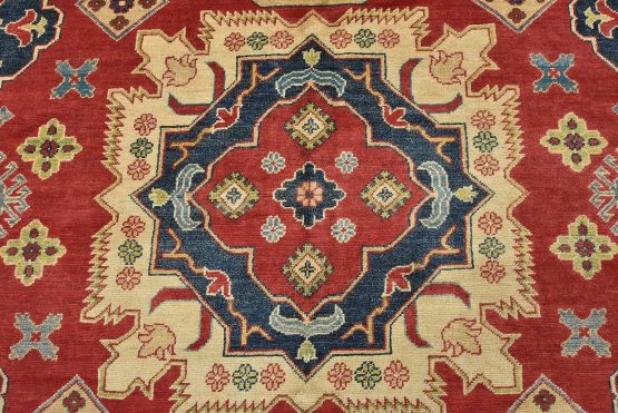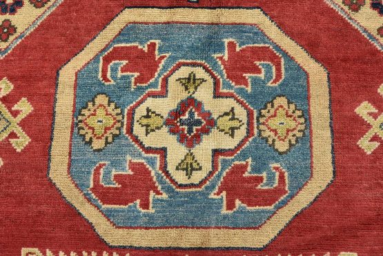 A tribal Caucasian Kazak rug hand-knotted with an all-wool pile on a cotton foundation. This oriental rug features a central geometric medallion surrounded by geometric motifs set against a red background. It is new and in excellent condition.