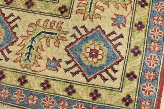 Original antique Kazak rugs from the Caucasus region inspire the creation of new Kazak rugs. These rugs are woven with fine wool using traditional Kazak patterns and finished with a low-cut pile to give them an authentic vintage look.