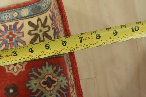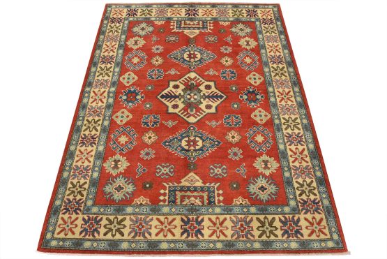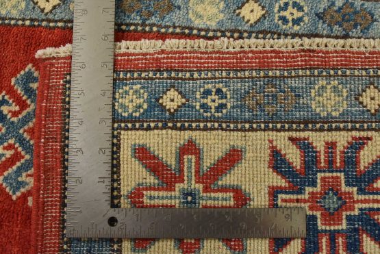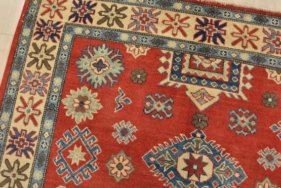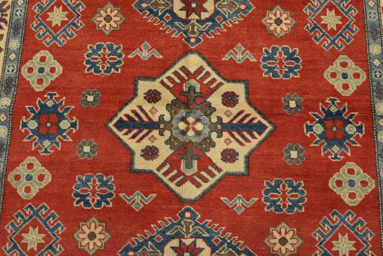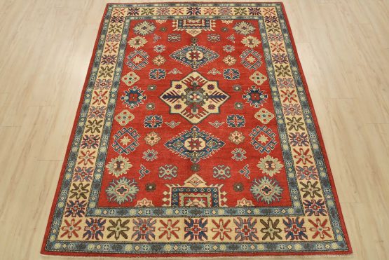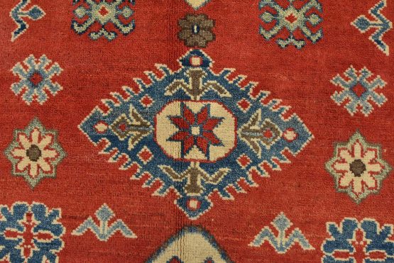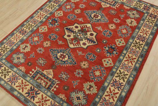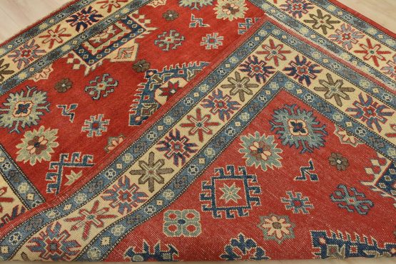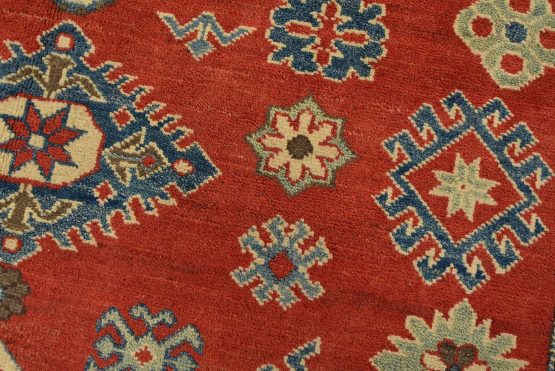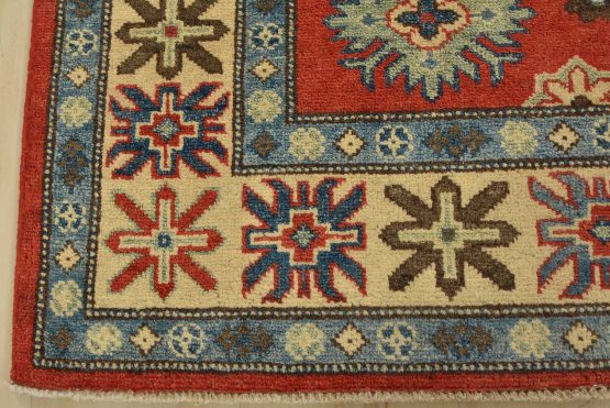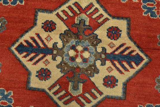 A tribal Caucasian Kazak rug hand-knotted with an all-wool pile on a cotton foundation. This oriental rug features a central geometric medallion surrounded by geometric motifs set against a red background. It is new and in excellent condition.