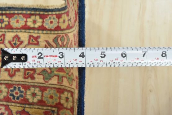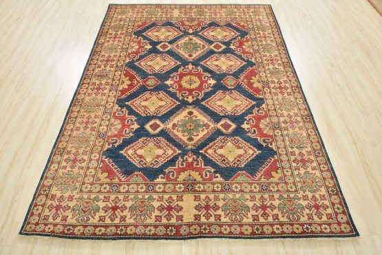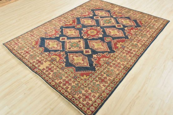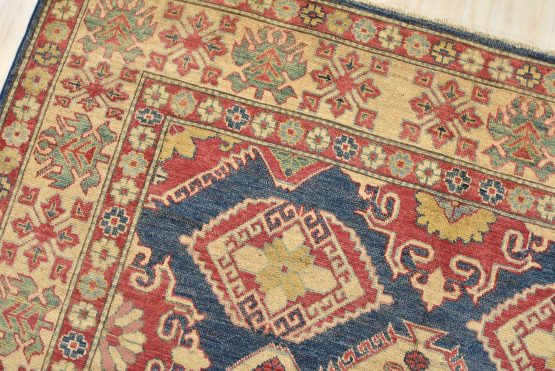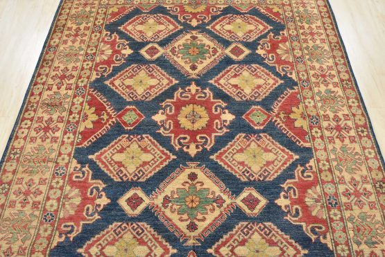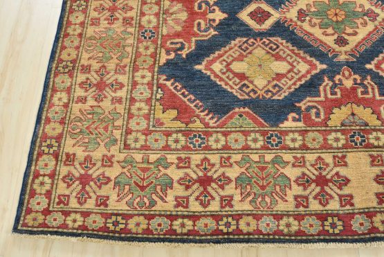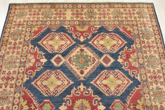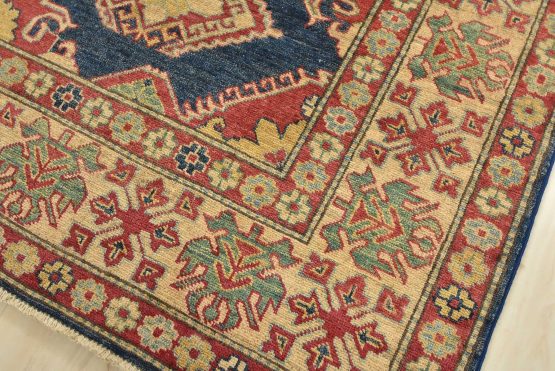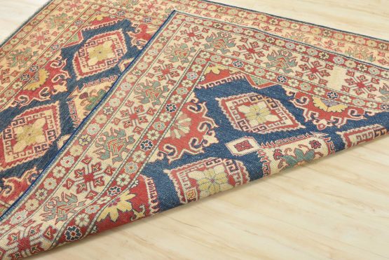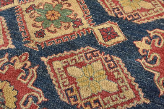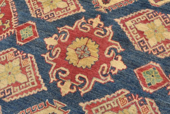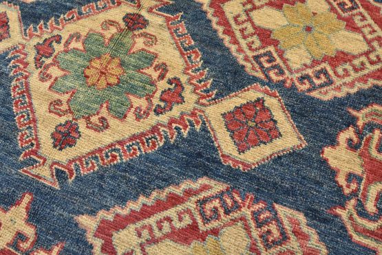 A traditional tribal Caucasian Kazak rug hand-knotted with an all-wool pile on a cotton foundation. This oriental rug features geometric medallions set against a blue background. It is new and in excellent condition.