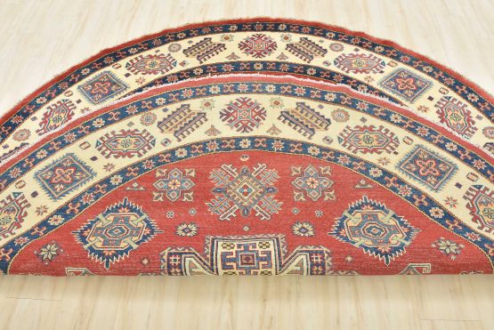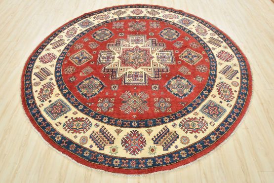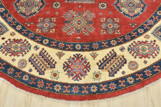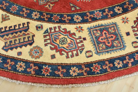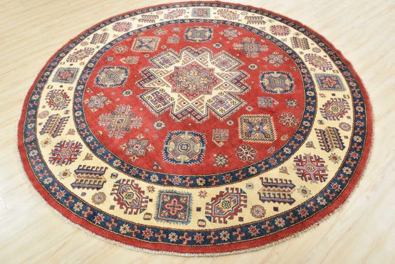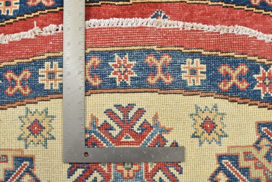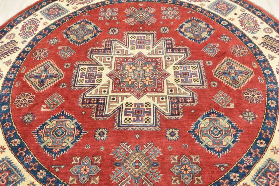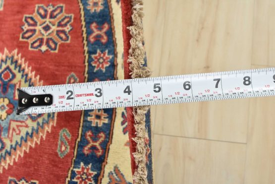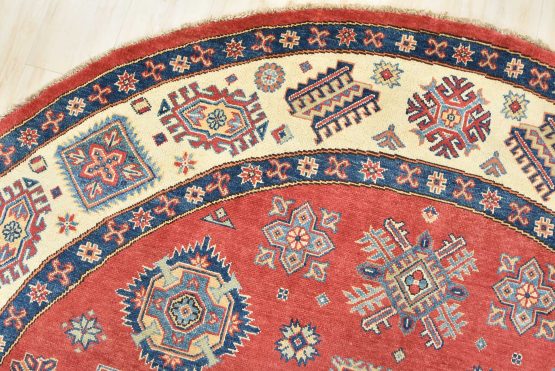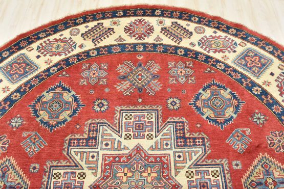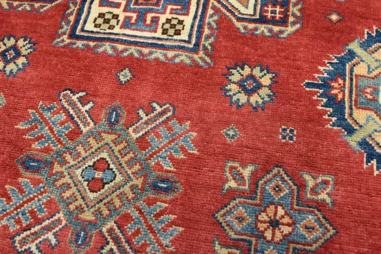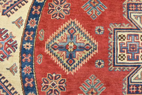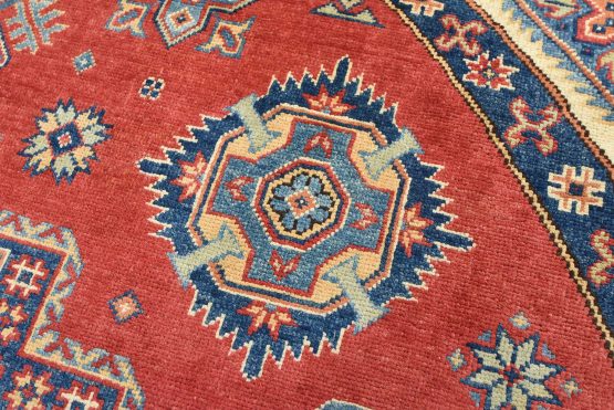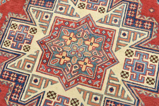 A tribal Caucasian Kazak rug hand-knotted with an all-wool pile on a cotton foundation. This oriental rug features a central geometric medallion surrounded by geometric motifs set against a red background. It is new and in excellent condition.