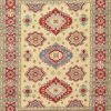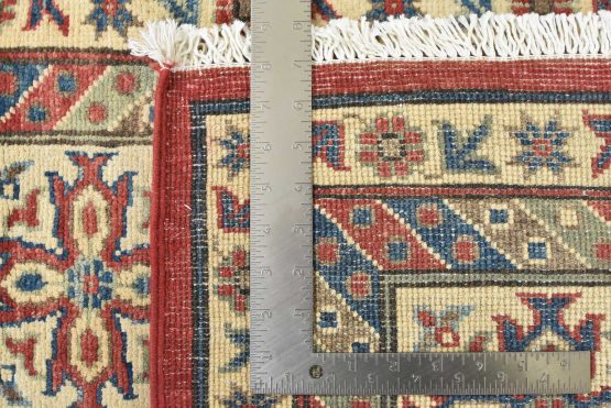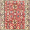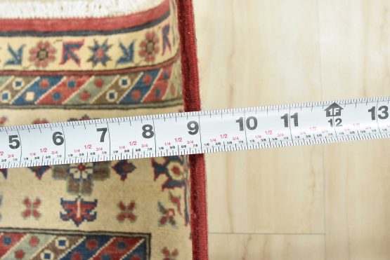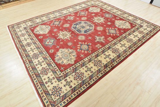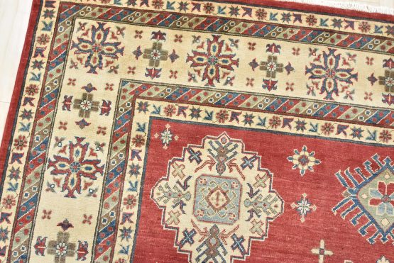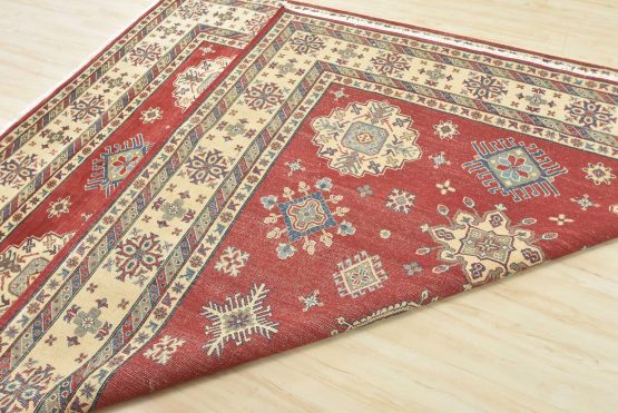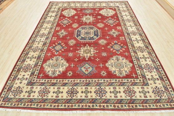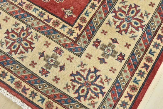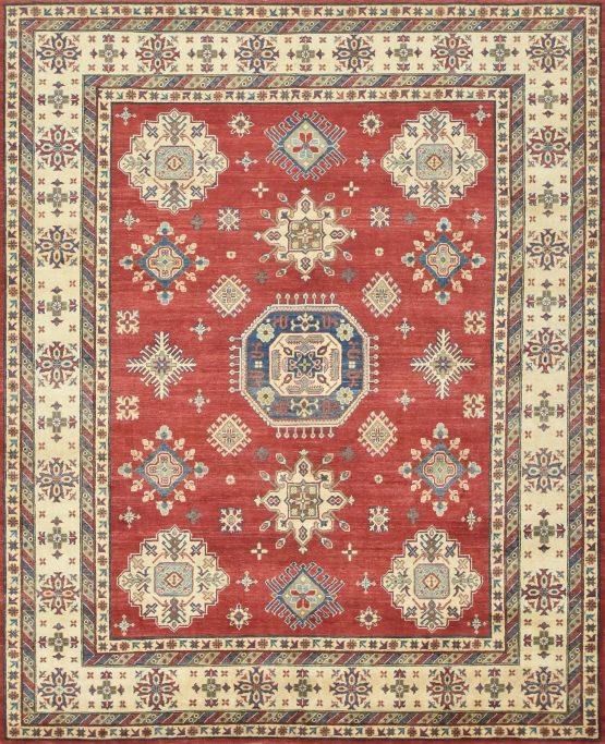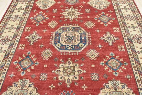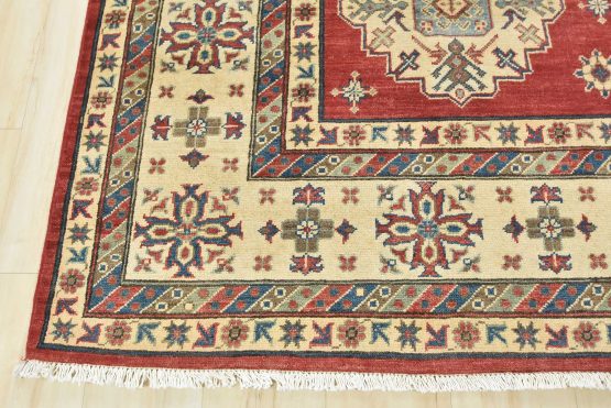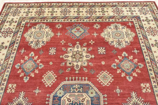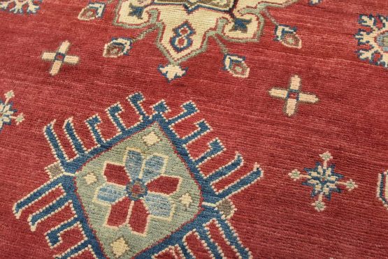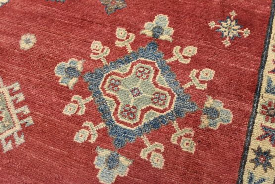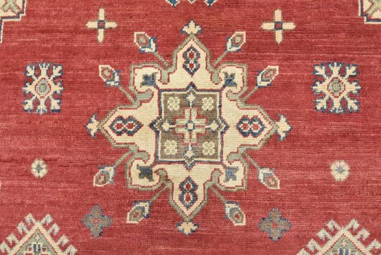 A traditional tribal Caucasian Kazak rug hand-knotted with an all-wool pile on a cotton foundation. This oriental rug features a central geometric medallion surrounded by geometric motifs set against a red background. It is new and in excellent condition.