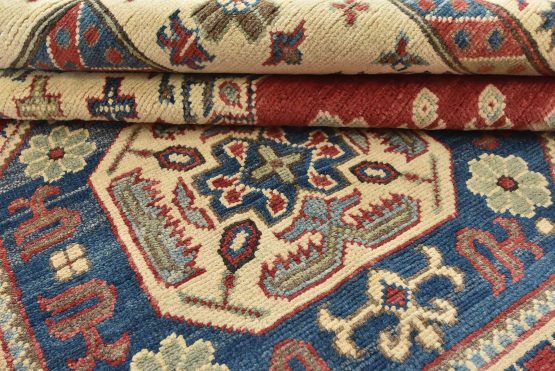 Original antique Kazak rugs from the Caucasus region inspire the creation of new Kazak rugs. These rugs are woven with fine wool using traditional Kazak patterns and finished with a low-cut pile, giving them an authentic vintage look.