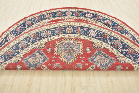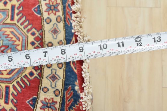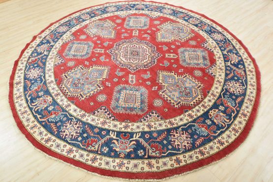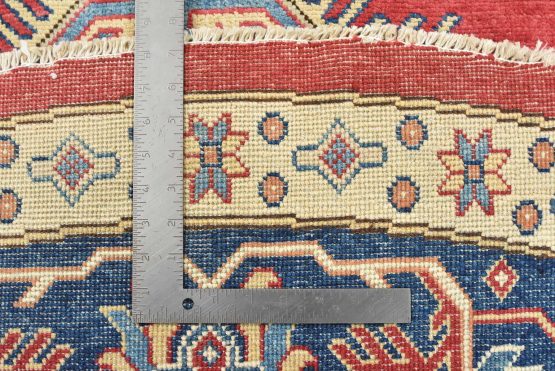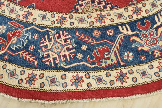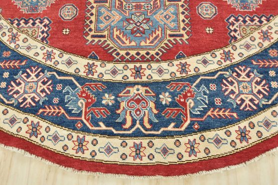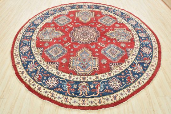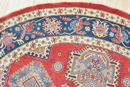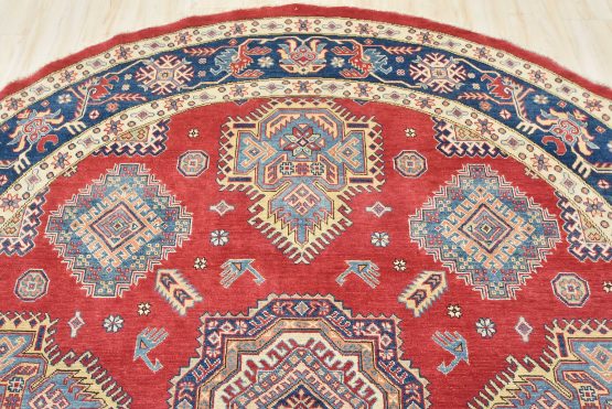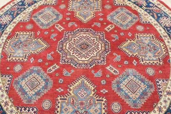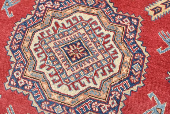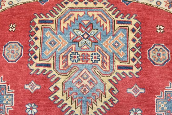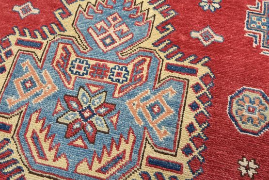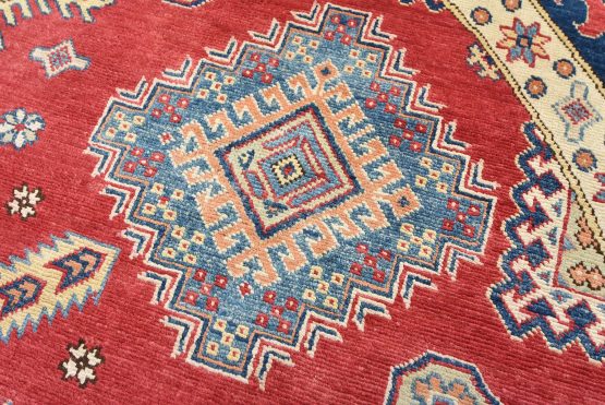 A tribal Caucasian Kazak rug hand-knotted with an all-wool pile on a cotton foundation. This oriental rug features a central geometric medallion surrounded by smaller geometric medallions set against a red background. It is new and in excellent condition.