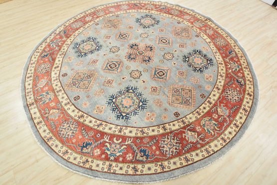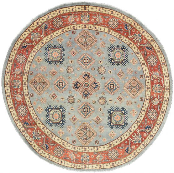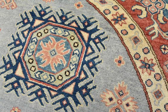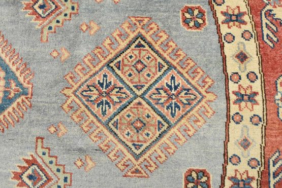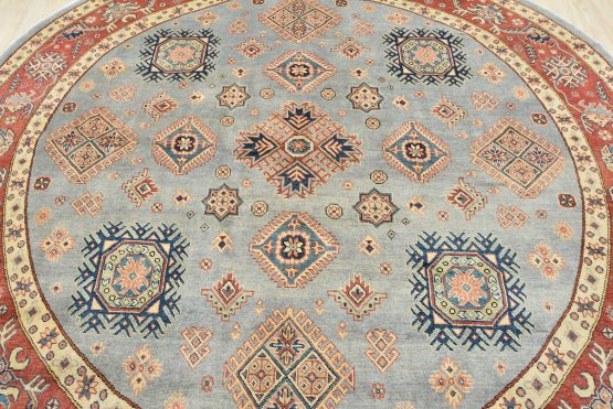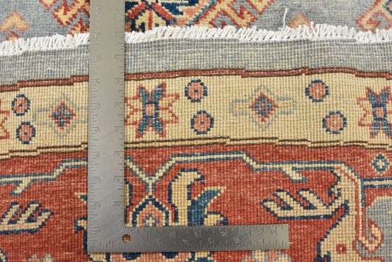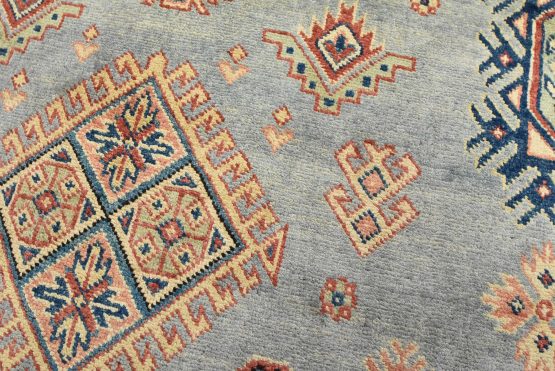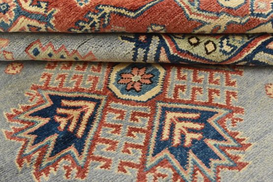 A tribal Caucasian Kazak rug hand-knotted with an all-wool pile on a cotton foundation. This oriental rug features an all-over design of geometric motifs set against a light blue background. It is new and in excellent condition.