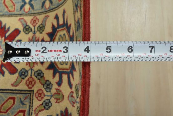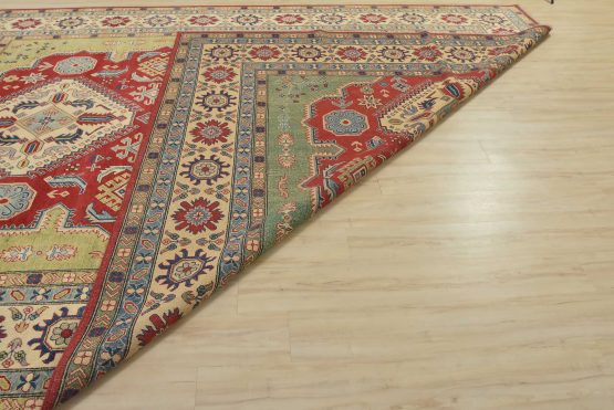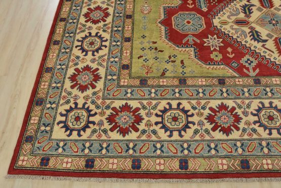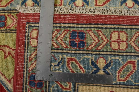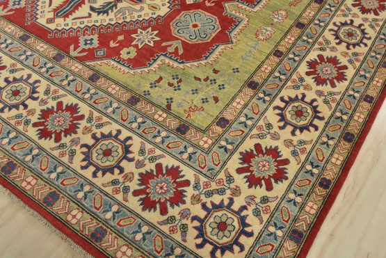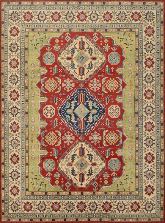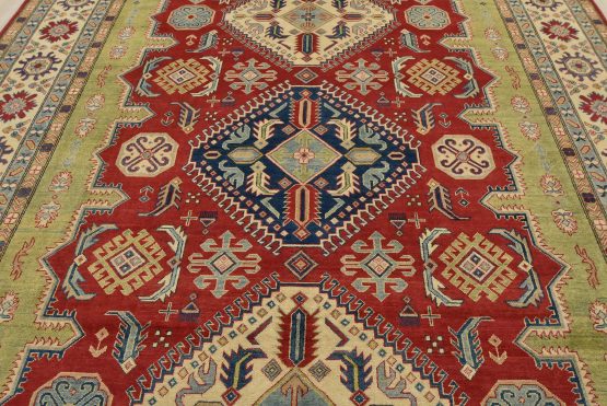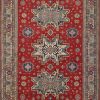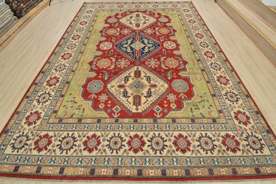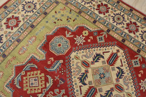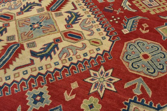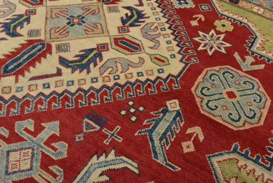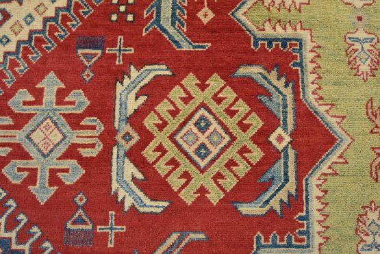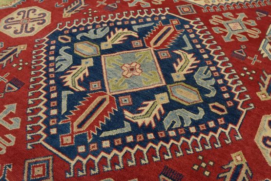A tribal Caucasian Kazak rug hand-knotted with an all-wool pile on a cotton foundation. This oriental rug features geometric medallions surrounded by geometric motifs set against a red background. It is new and in excellent condition.