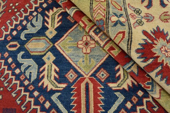 Original antique Kazak rugs from the Caucasus region inspire the creation of new Kazak rugs. These rugs are woven with fine wool using traditional Kazak patterns and finished with a low-cut pile to give them an authentic vintage look.