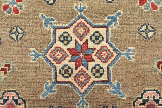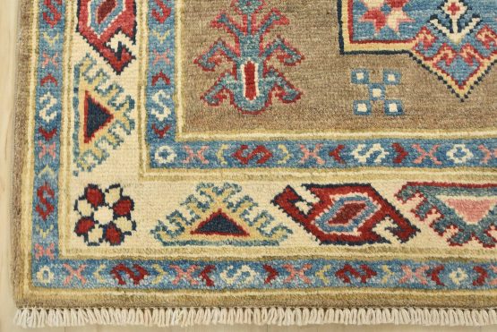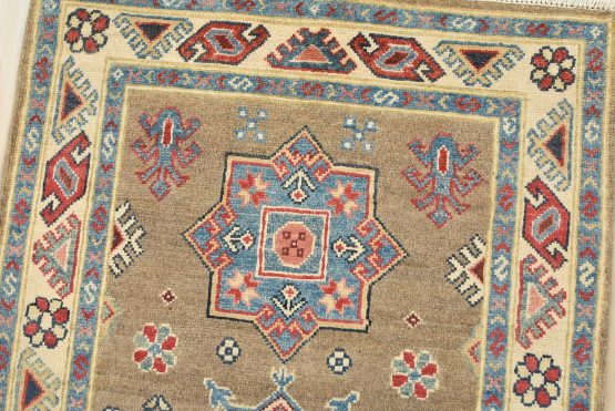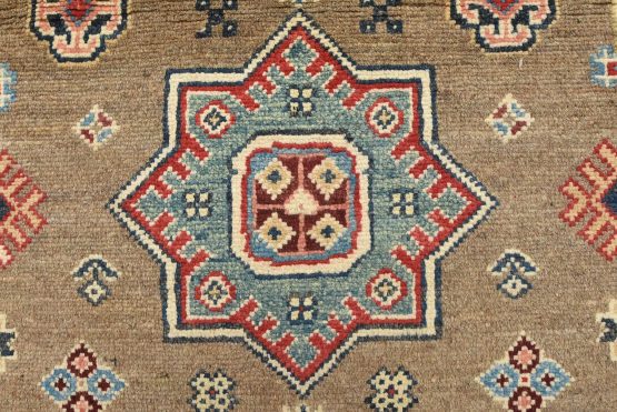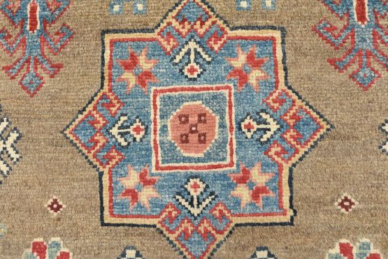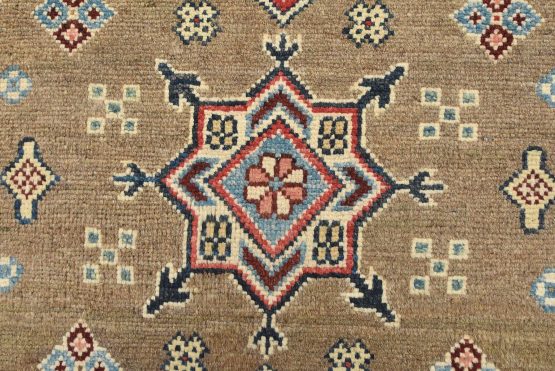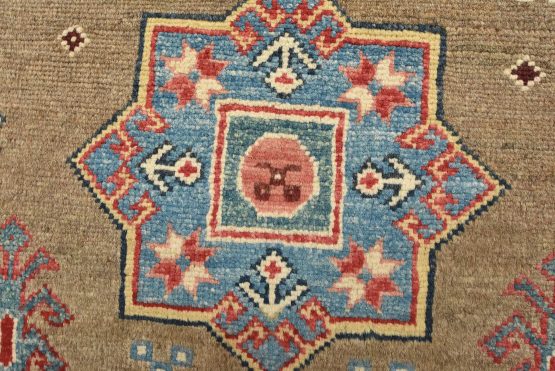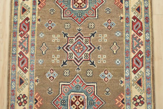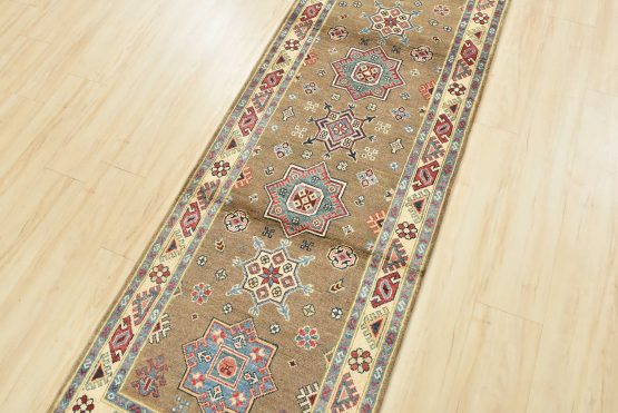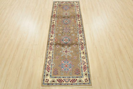 A tribal Caucasian Kazak runner hand-knotted with an all-wool pile on a cotton foundation. This oriental rug features a row of geometric medallions surrounded by geometric motifs set against a brown background. It is new and in excellent condition.