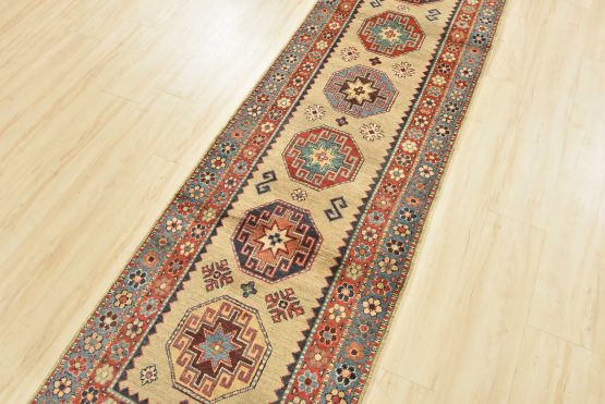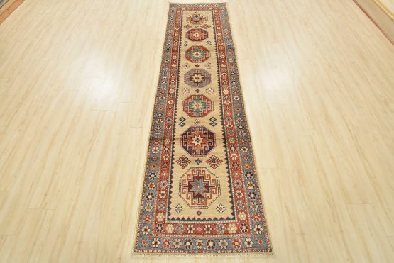 A tribal Caucasian Kazak runner hand-knotted with an all-wool pile on a cotton foundation. This oriental rug features a row of geometric medallions surrounded by small geometric motifs set against a brown background. It is new and in excellent condition.
