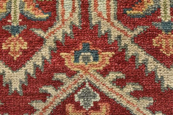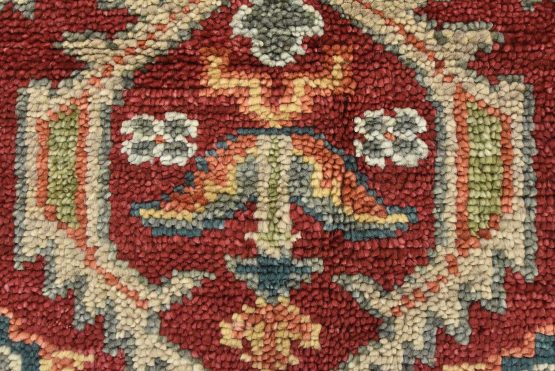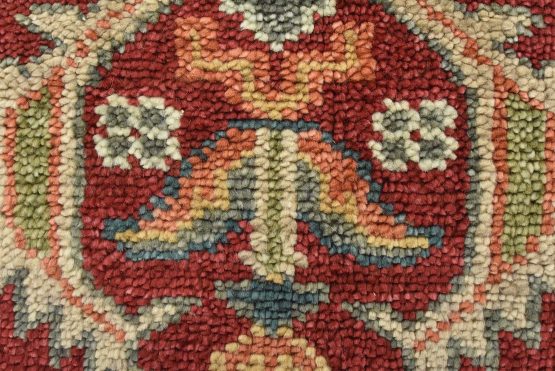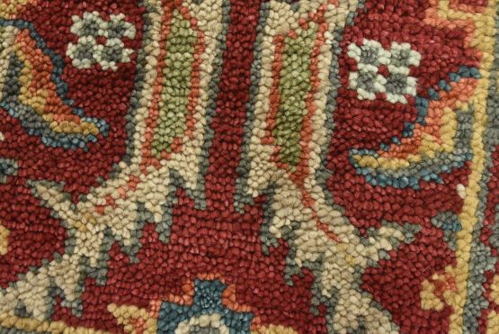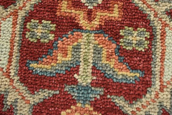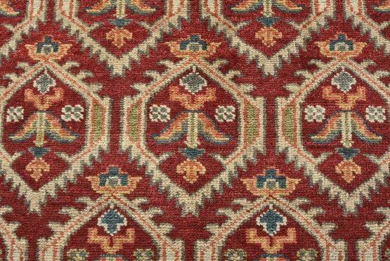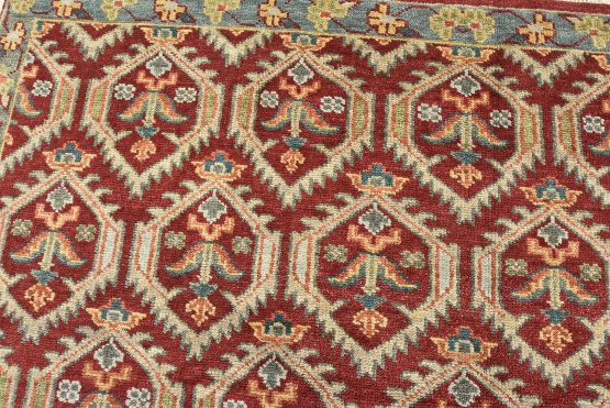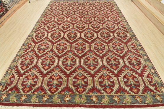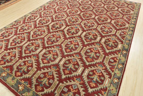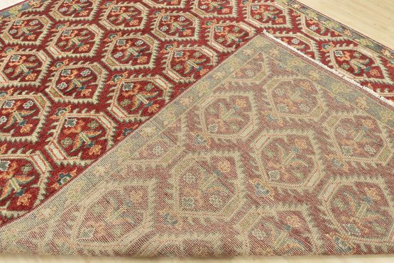 A traditional Anatolian rug hand-knotted with an all-wool pile on a cotton foundation. This oriental rug features repeating geometric botanical motifs set against a red background. It is new and in excellent condition.