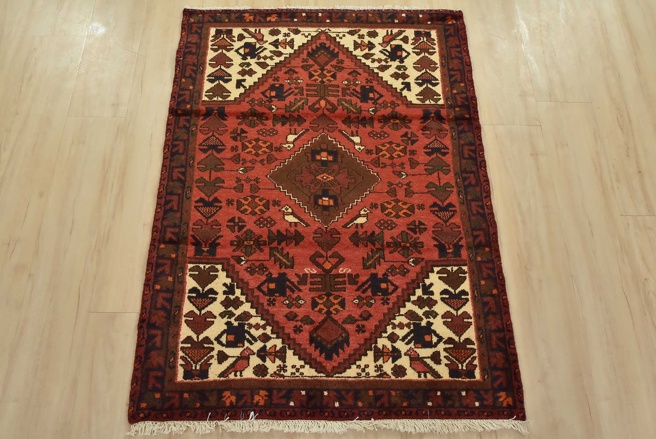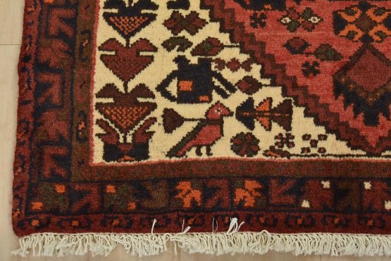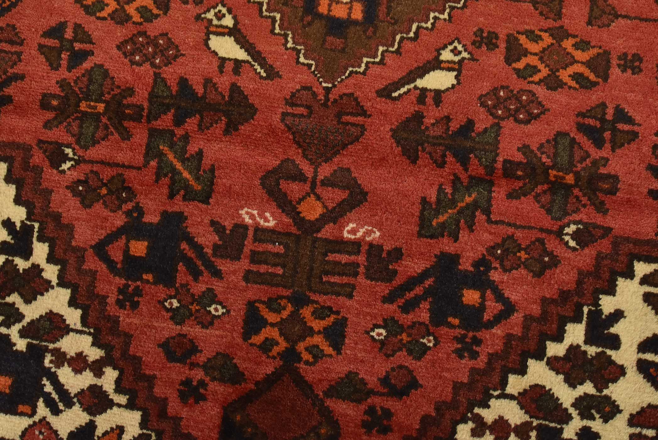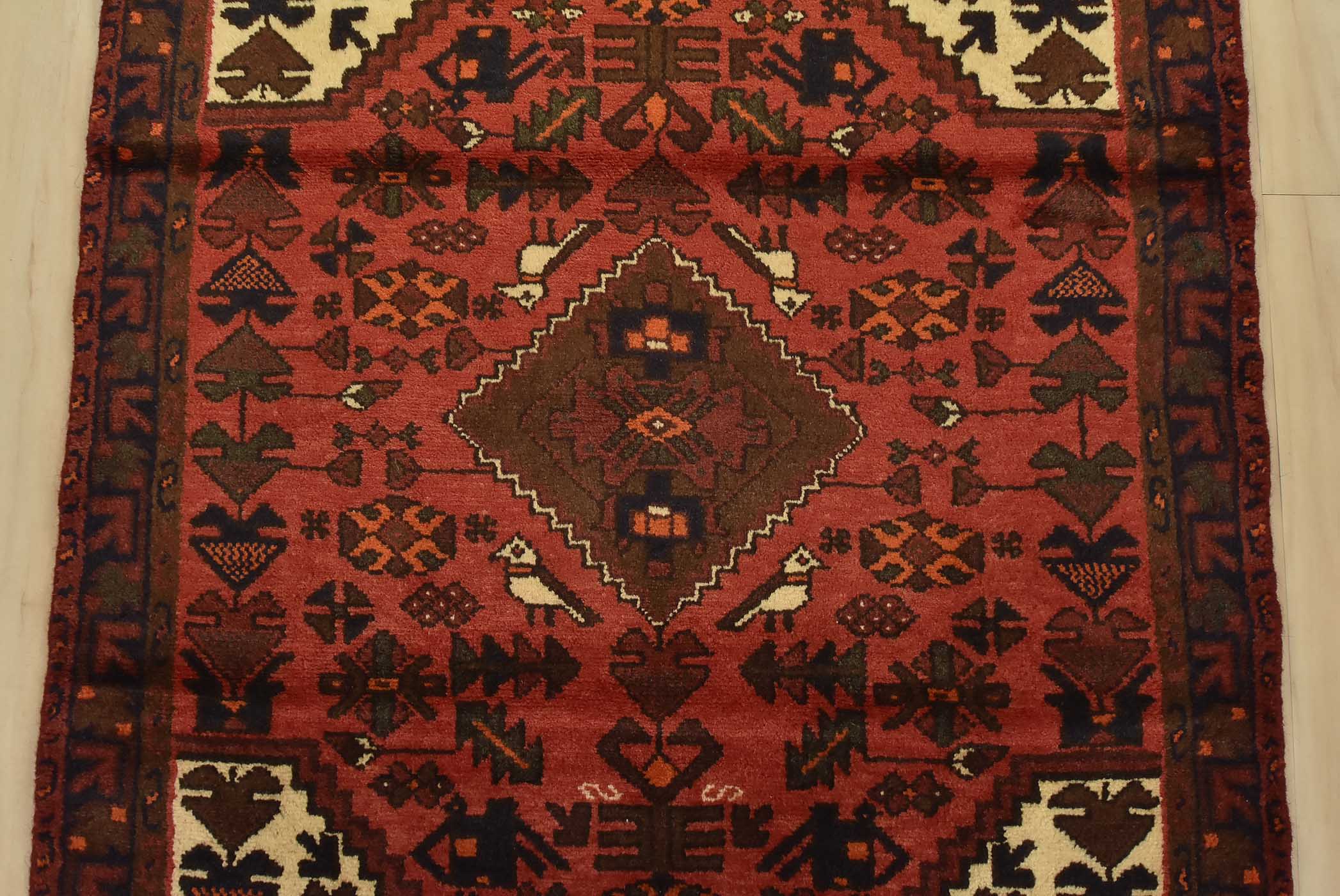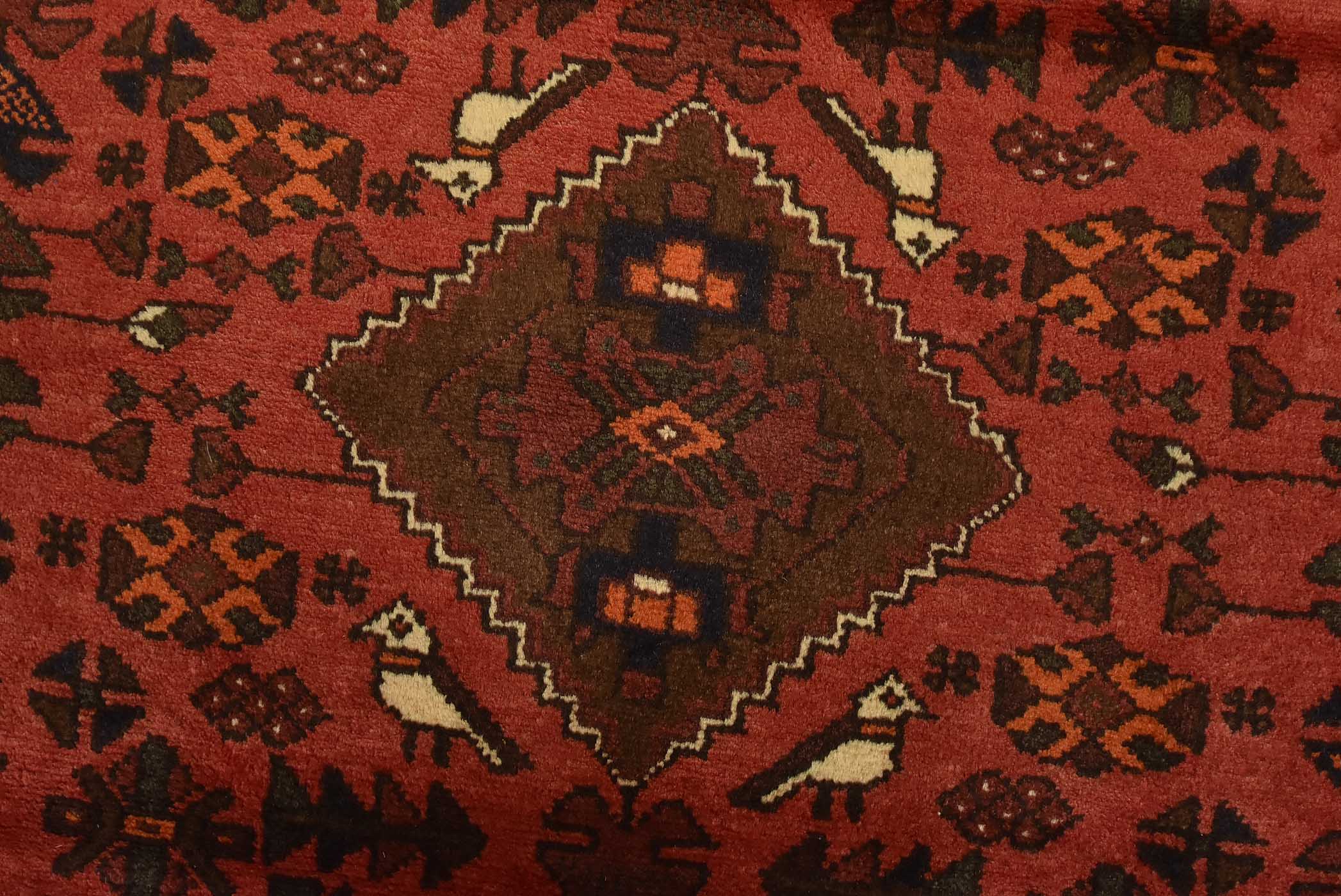 An authentic vintage tribal Hamedan rug hand-knotted with fine wool and natural dyes. This nomadic rug features a central medallion surrounded by geometric motifs and bird figures set against a red background. It has a full wool pile with no worn areas and is in very good condition.