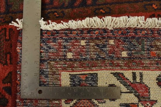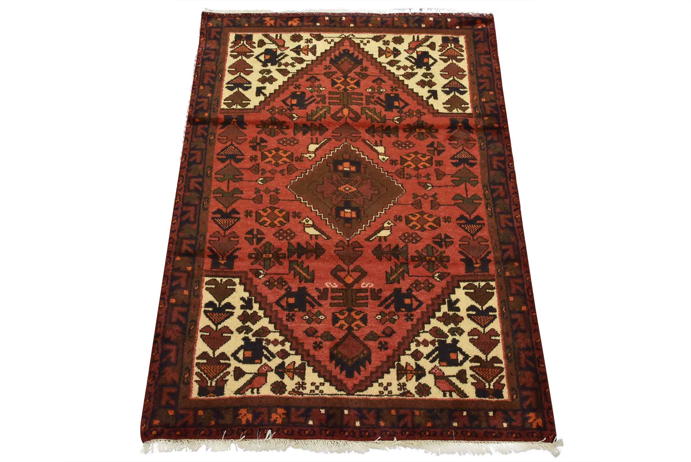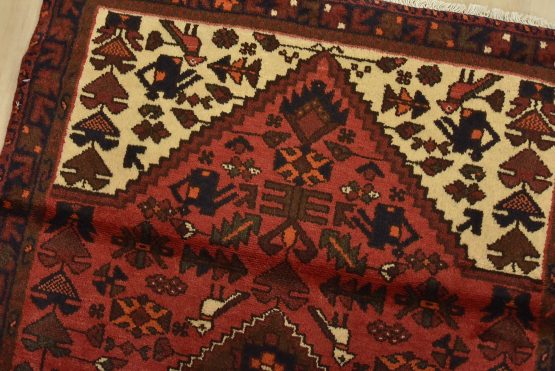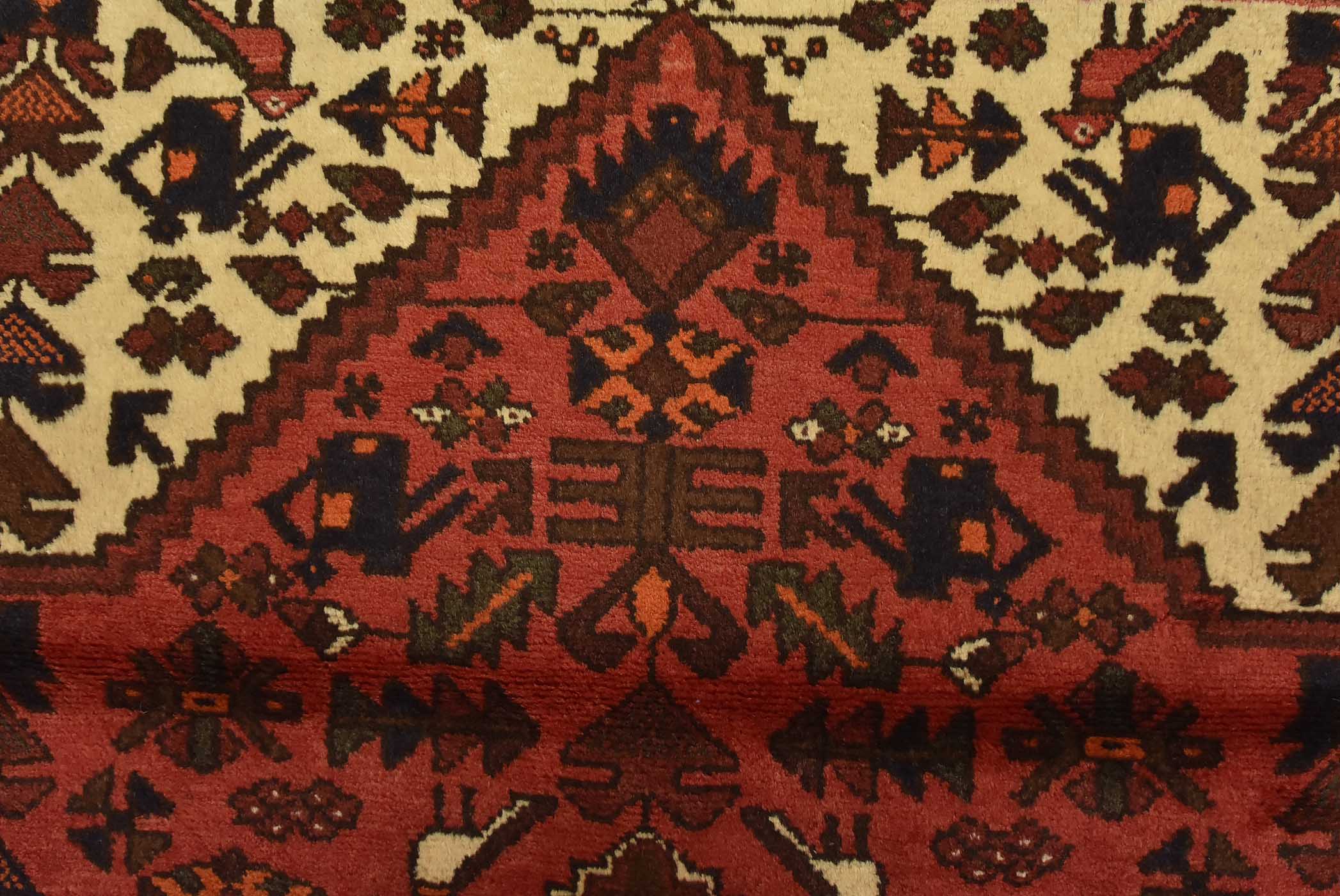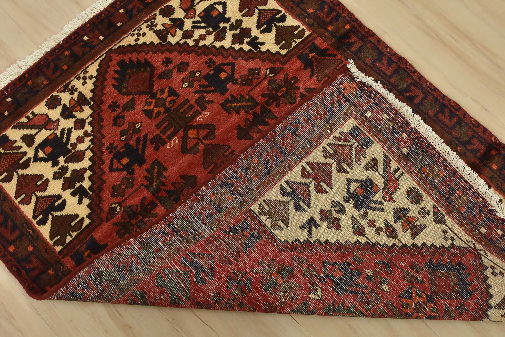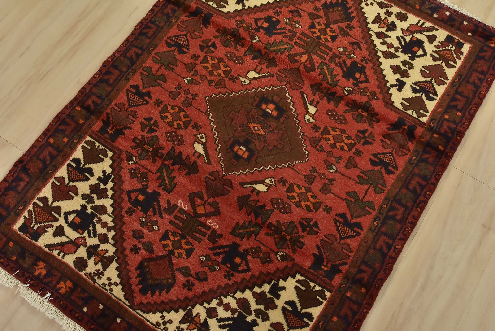 An authentic vintage tribal Hamedan rug hand-knotted with fine wool and natural dyes. This nomadic rug features a central medallion surrounded by geometric motifs and bird figures set against a red background. It has a full wool pile with no worn areas and is in very good condition.
