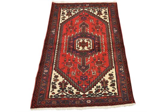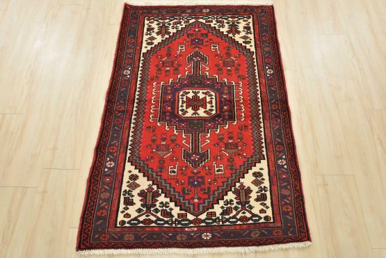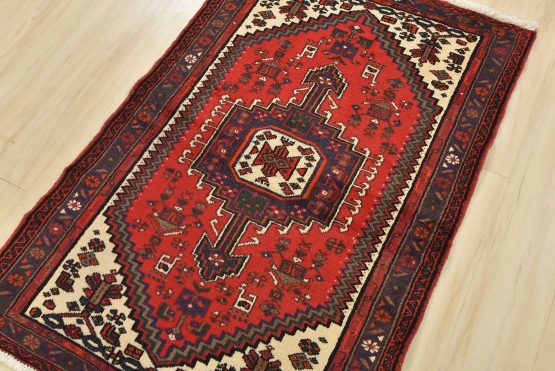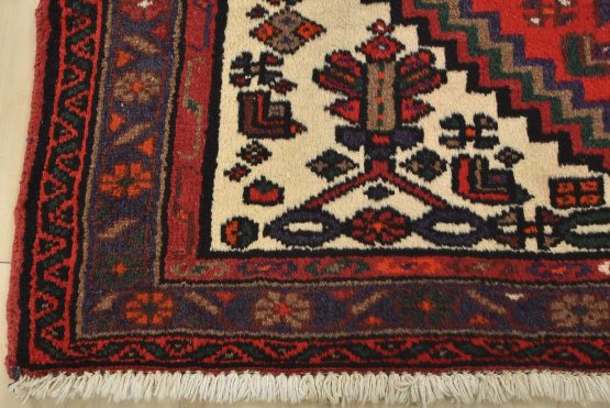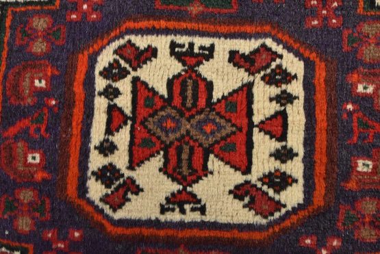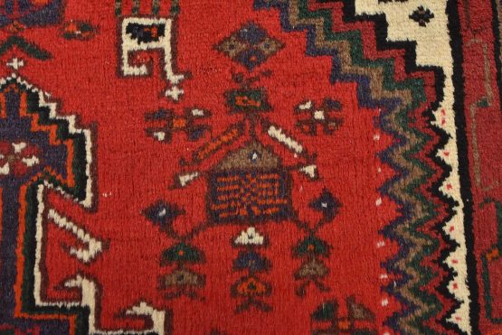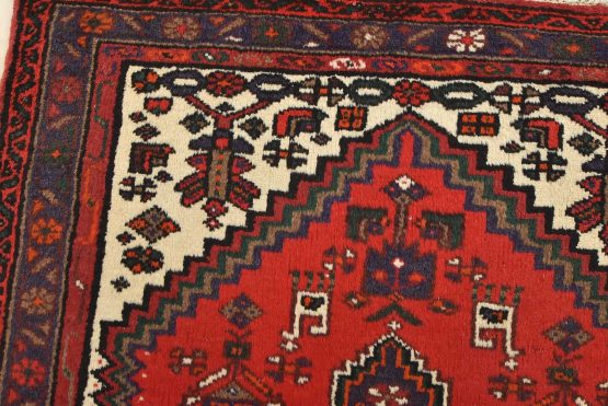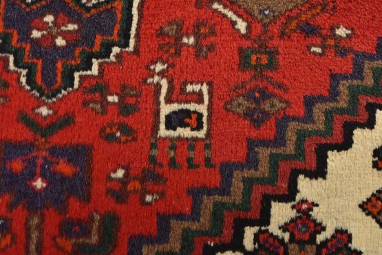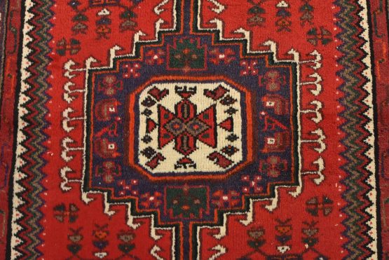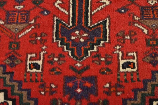 An authentic vintage tribal Hamedan rug hand-knotted with fine wool and natural dyes. This nomadic oriental rug features a central geometric medallion surrounded by geometric motifs and animal figures set against a red background. The wool pile does show some minor wear; please refer to the photos. Otherwise, this rug is in very good condition.