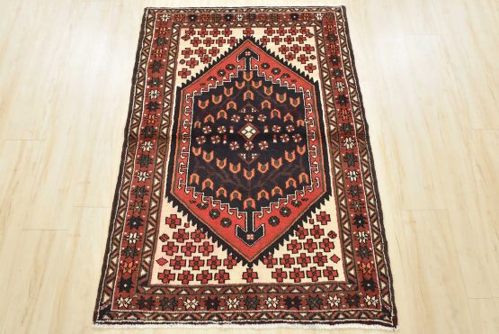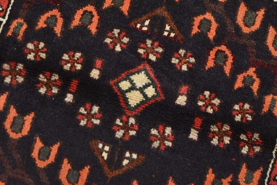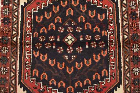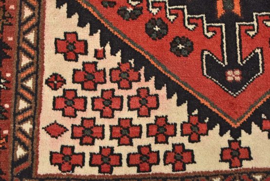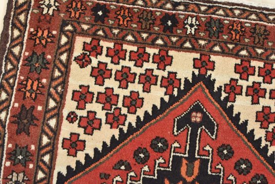 An authentic vintage tribal Hamedan rug hand-knotted with fine wool and natural dyes. This nomadic oriental rug features a geometric medallion surrounded by geometric flowers set against a red background. The dyes have bled in one corner; please refer to the photos. Otherwise, this rug has a full wool pile and is in very good condition.
