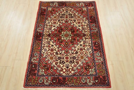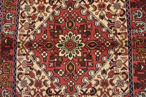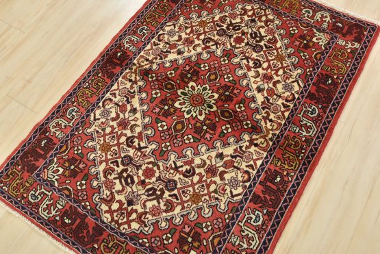 An authentic vintage tribal Hamedan rug hand-knotted with fine wool and natural dyes. This nomadic oriental rug features a central geometric medallion surrounded by a Herati pattern set against an ivory background. It has a full wool pile with no worn areas and is in very good condition.