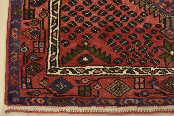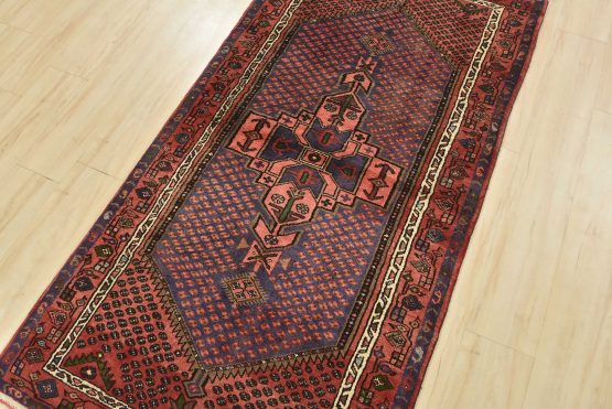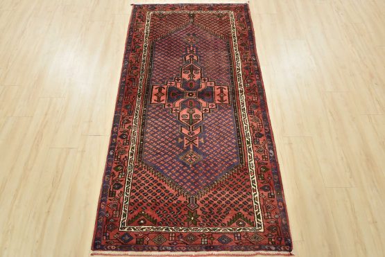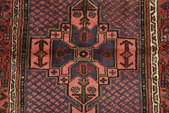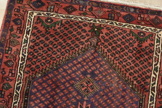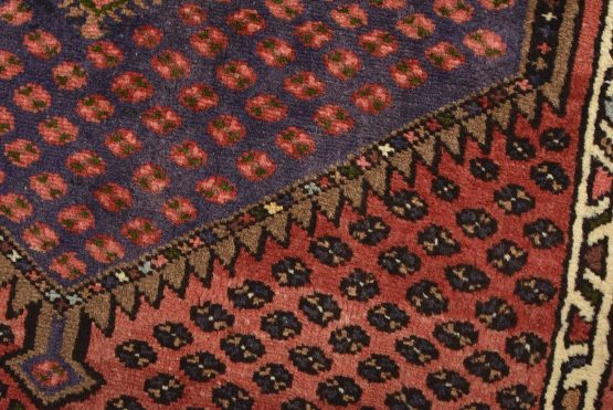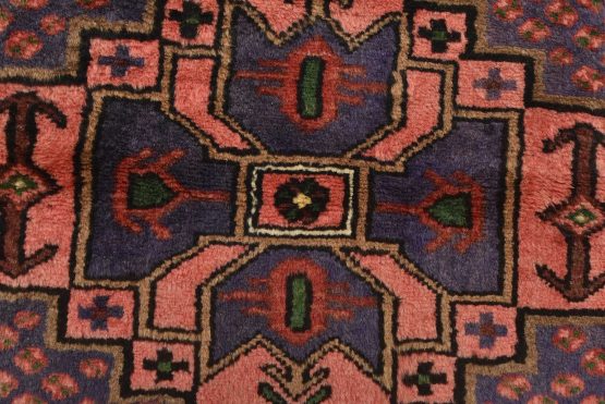 An authentic semi-antique tribal Hamedan rug hand-knotted with fine wool and natural dyes. This nomadic oriental rug features a central geometric medallion set against a purple background, surrounded by a small circular floral pattern. It has a full wool pile with no worn areas and is in very good condition.