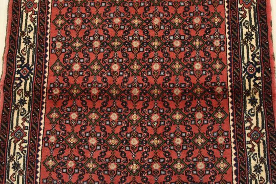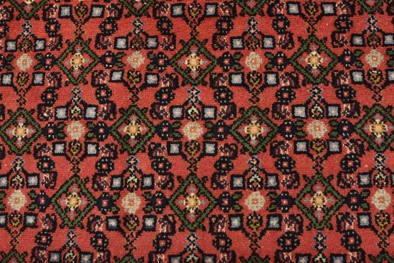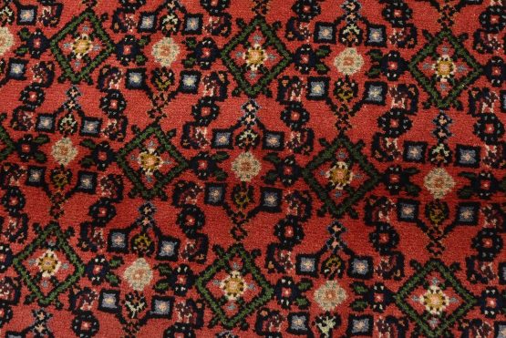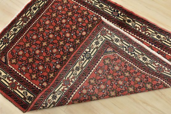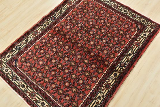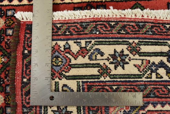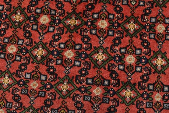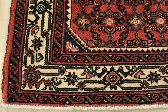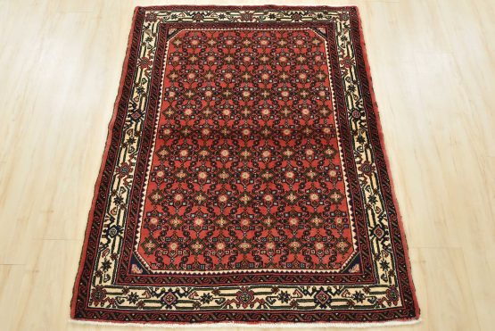 An authentic vintage tribal Hamedan rug hand-knotted with fine wool and natural dyes. This nomadic oriental rug features an all-over geometric Herati pattern set against a red background. It has a full wool pile with no worn areas and is in very good condition.