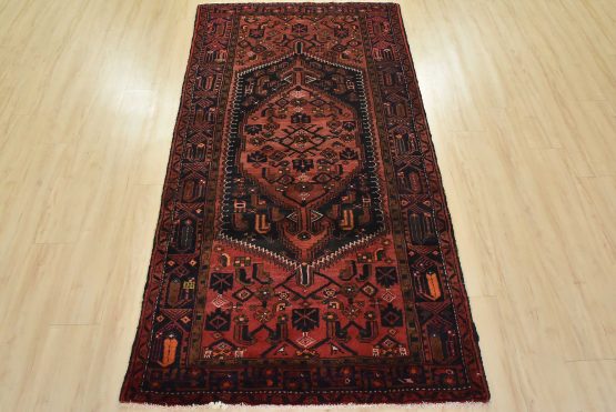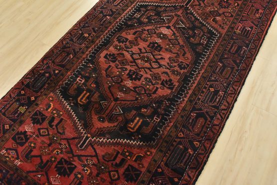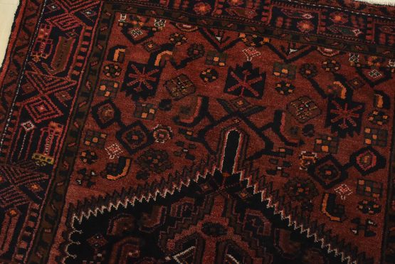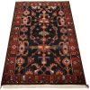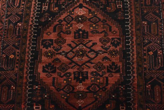 An authentic vintage tribal Hamedan rug hand-knotted with fine wool and natural dyes. This nomadic oriental rug features a central geometric medallion surrounded by geometric motifs set against a blue background. It has a full wool pile with no worn areas and is in very good condition.
