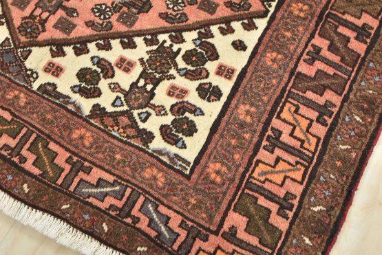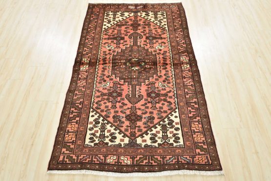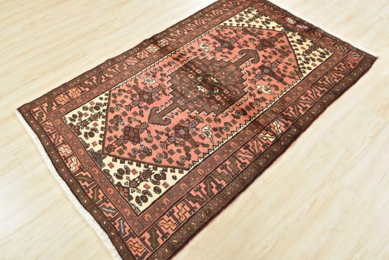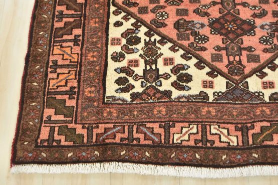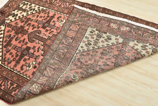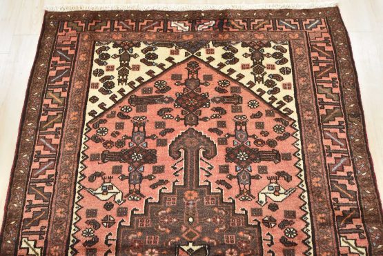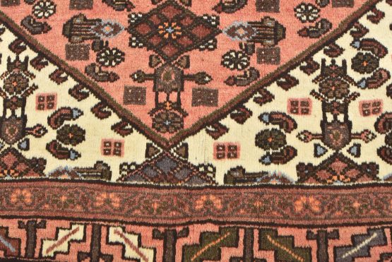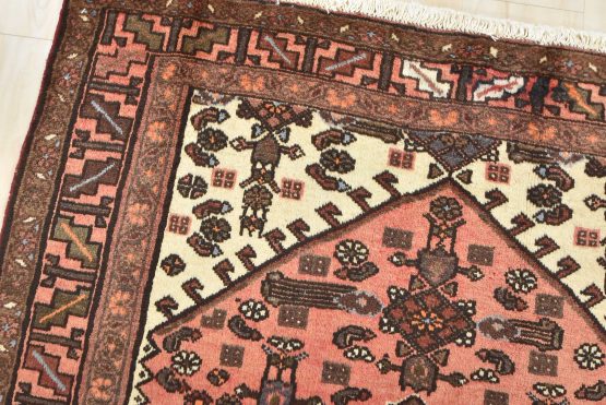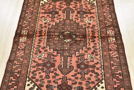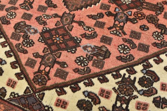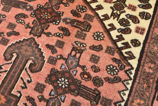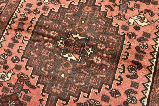 An authentic vintage tribal Hamedan rug hand-knotted with fine wool and natural dyes. This nomadic oriental rug features a geometric medallion surrounded by geometric motifs with bird figures set against a pink background. The wool pile does show some minor wear; please refer to the photos. Otherwise, this rug is in very good condition.
