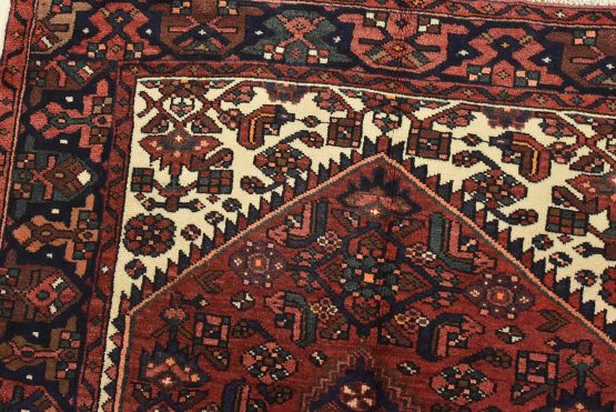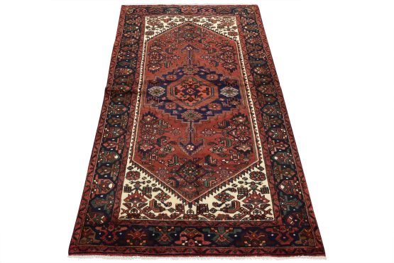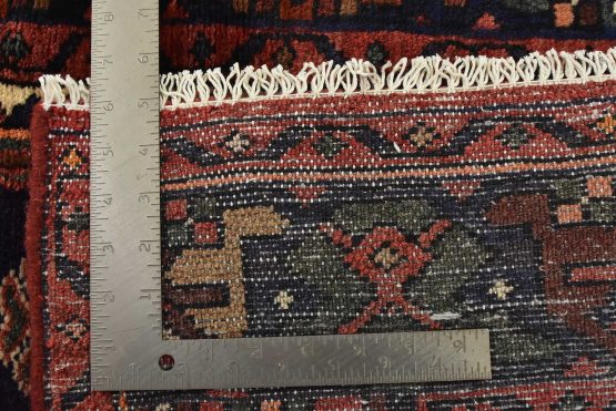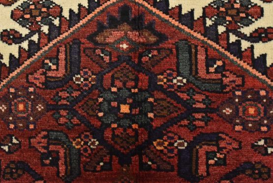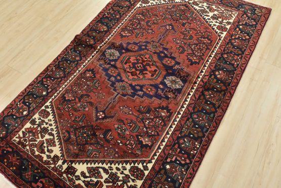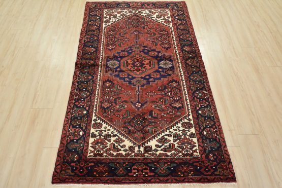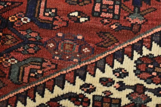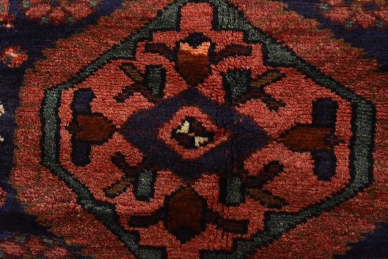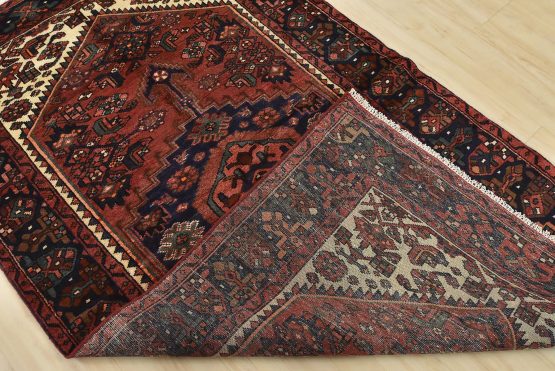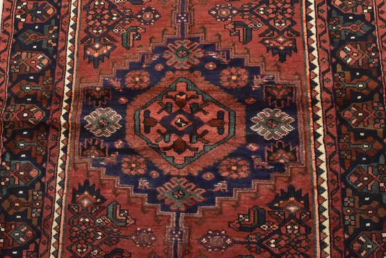An authentic vintage tribal Hamedan rug hand-knotted with fine wool and natural dyes. This nomadic oriental rug features a central geometric medallion surrounded by a Herati pattern set against a red background. It has a full wool pile with no worn areas and is in very good condition.