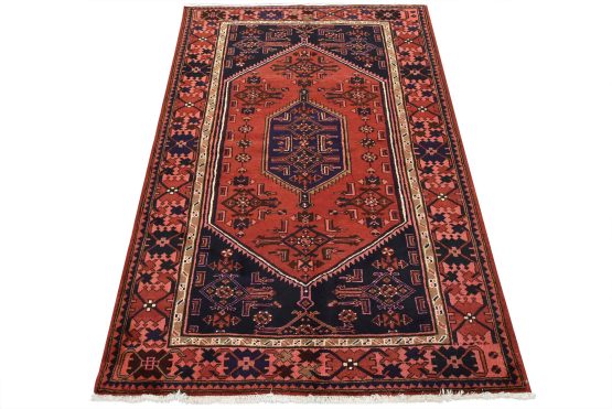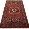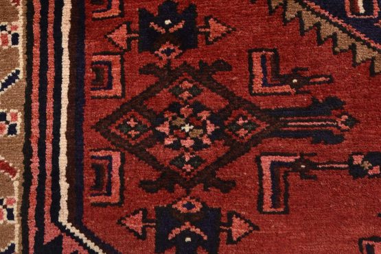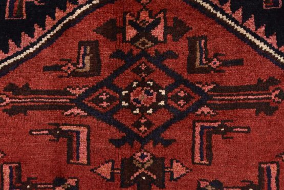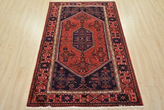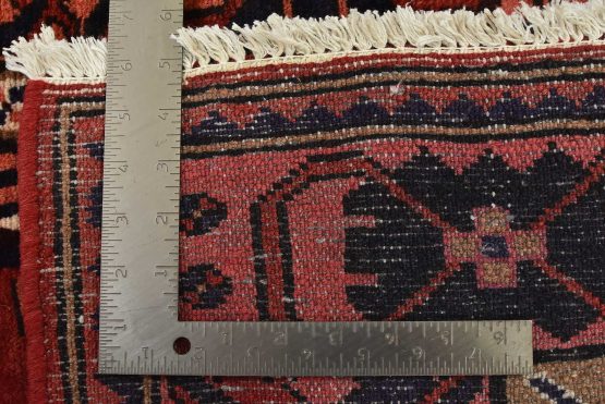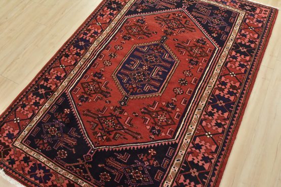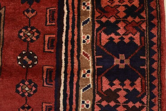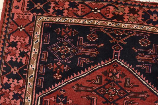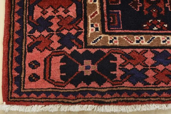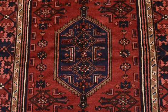 An authentic vintage tribal Hamedan rug hand-knotted with fine wool and natural dyes. This nomadic oriental rug features a central medallion surrounded by a Herati pattern set against a red background. It has a full wool pile with no worn areas and is in very good condition.