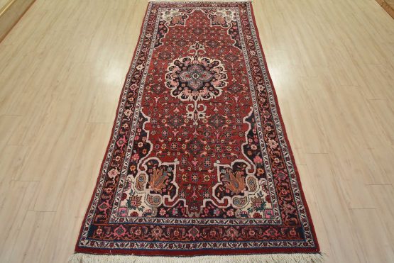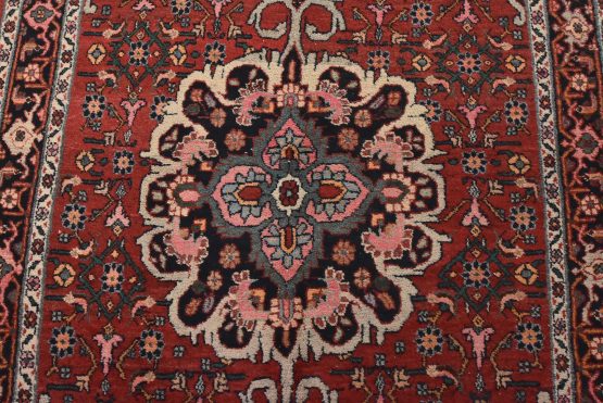An authentic vintage tribal Hamedan rug hand-knotted with fine wool and natural dyes. This nomadic oriental rug features a central medallion surrounded by a geometric Herati pattern set against a red background. The wool pile shows some minor wear; please refer to the photos. Otherwise, the rug is in very good condition.