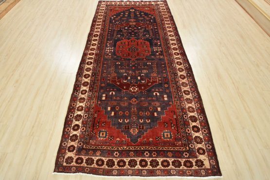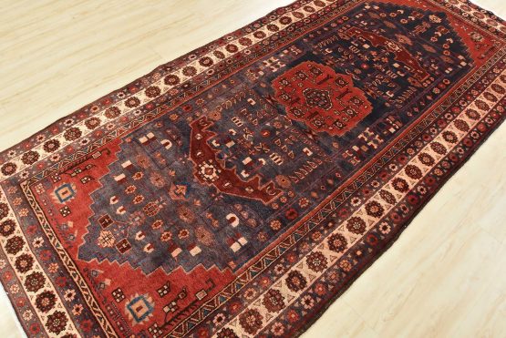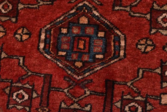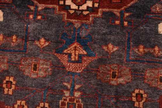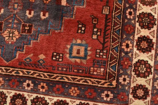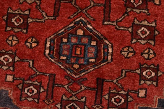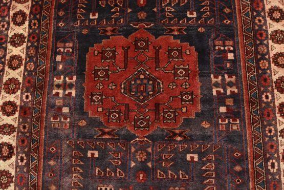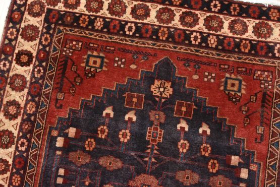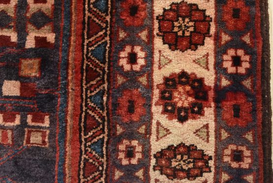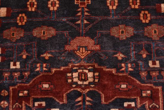 An authentic vintage tribal Hamedan rug hand-knotted with fine wool and natural dyes. This nomadic oriental rug features a central medallion surrounded by geometric flowers and botanical motifs set against a dark blue background. The wool pile does show some minimal wear; please refer to the photos. Otherwise, this rug is in very good condition.
