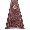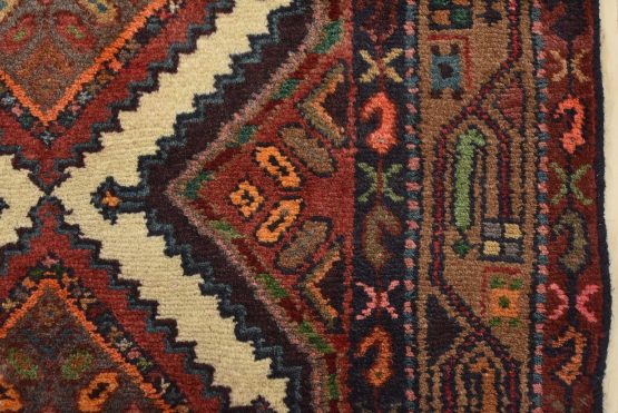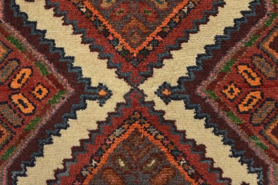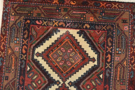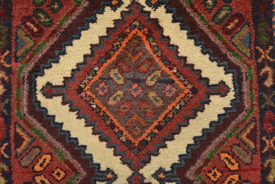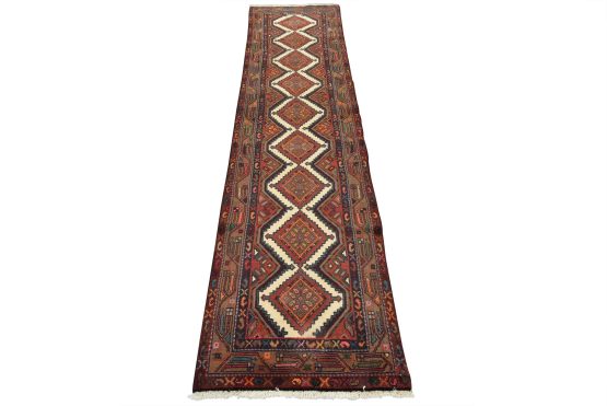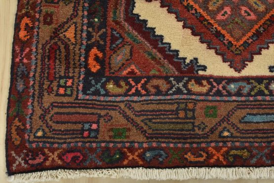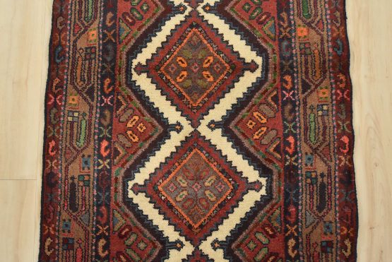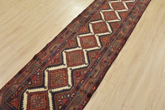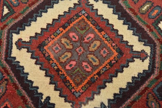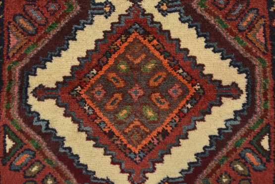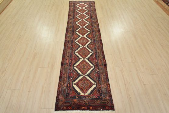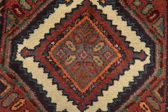 An authentic vintage Hamedan tribal runner hand-knotted with fine wool and natural dyes. This nomadic oriental rug features a row of geometric medallions set against an ivory background. This rug has a full wool pile with no worn areas and is in very good condition.