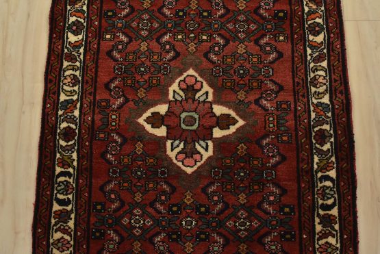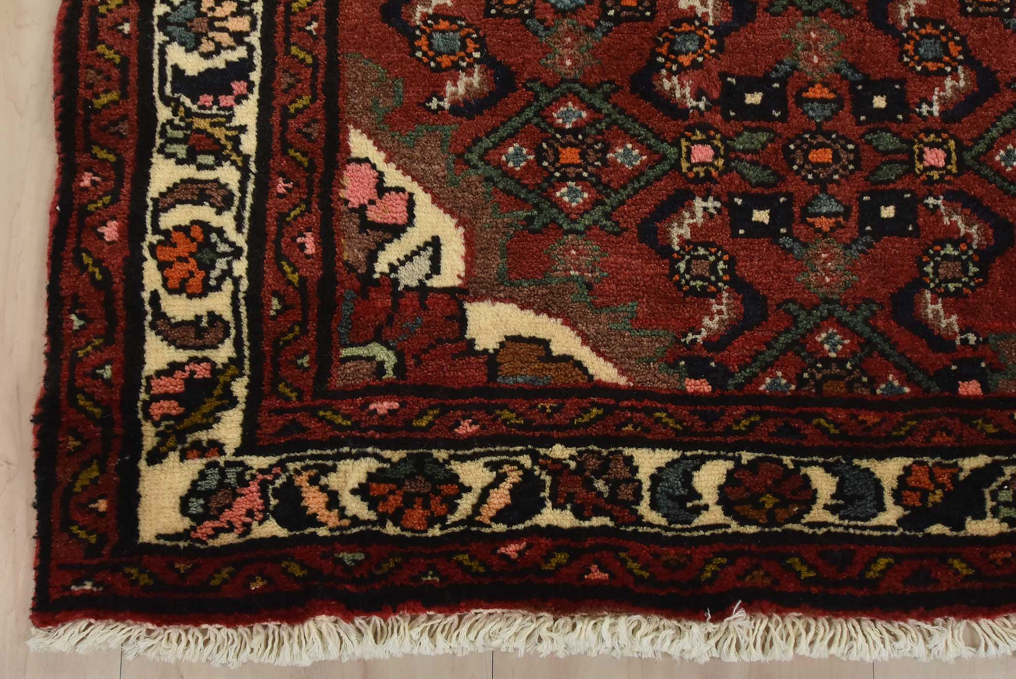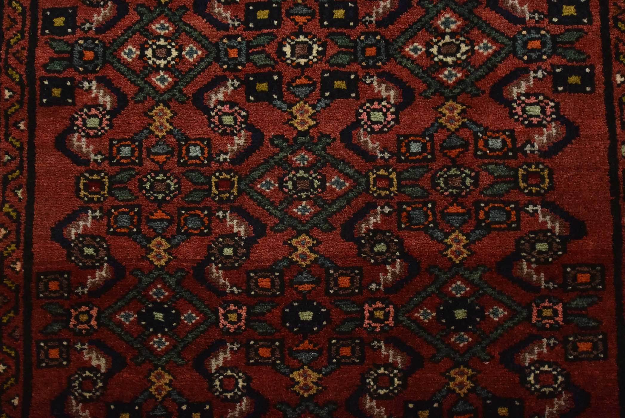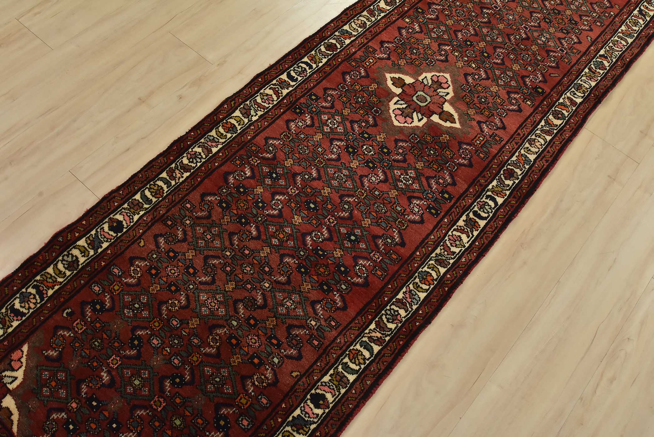 An authentic vintage tribal Hamedan runner hand-knotted with fine wool and natural dyes. This nomadic rug features a central medallion surrounded by a Herati pattern set against a red background. It has a full wool pile with no worn areas and is in very good condition.