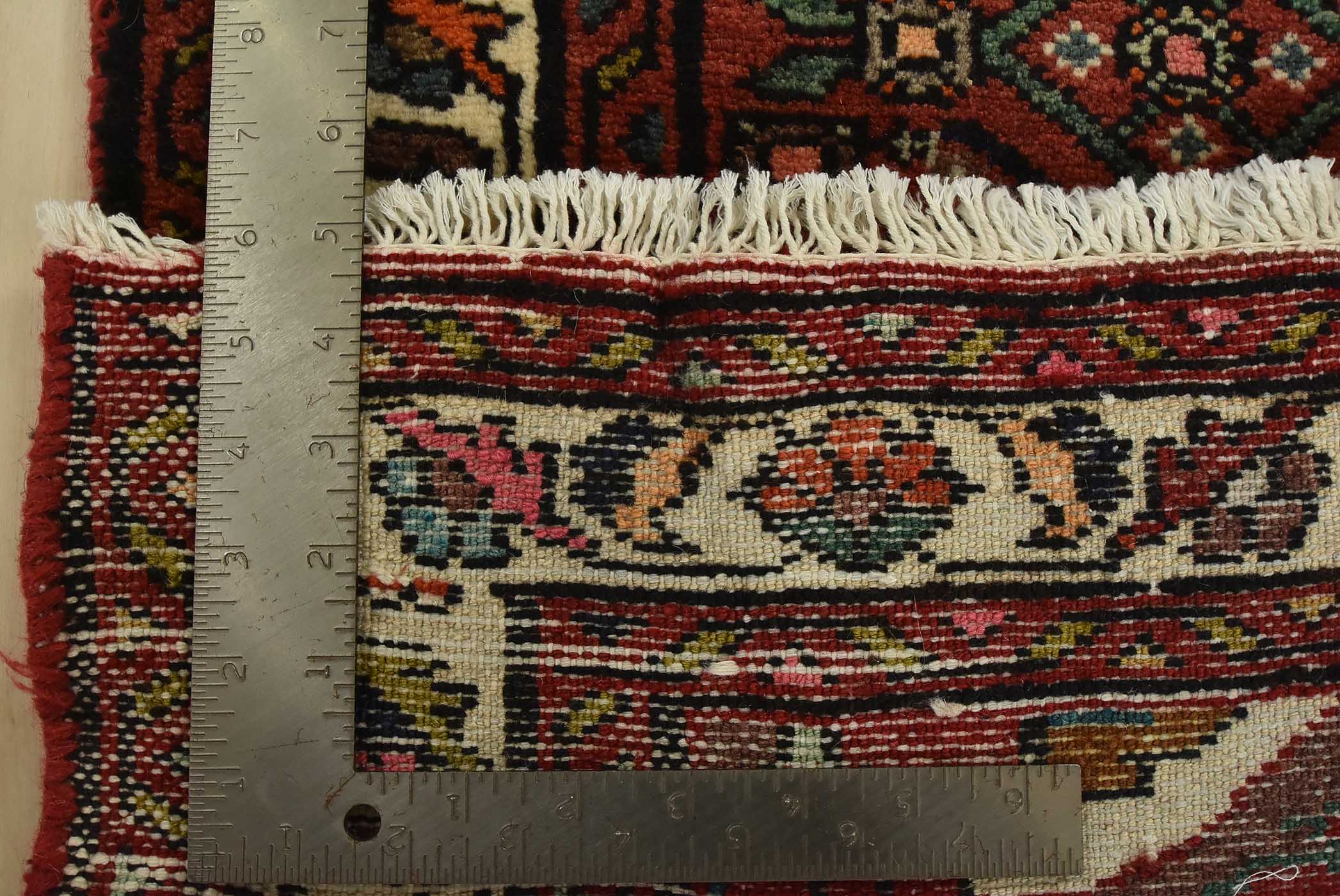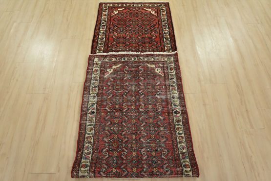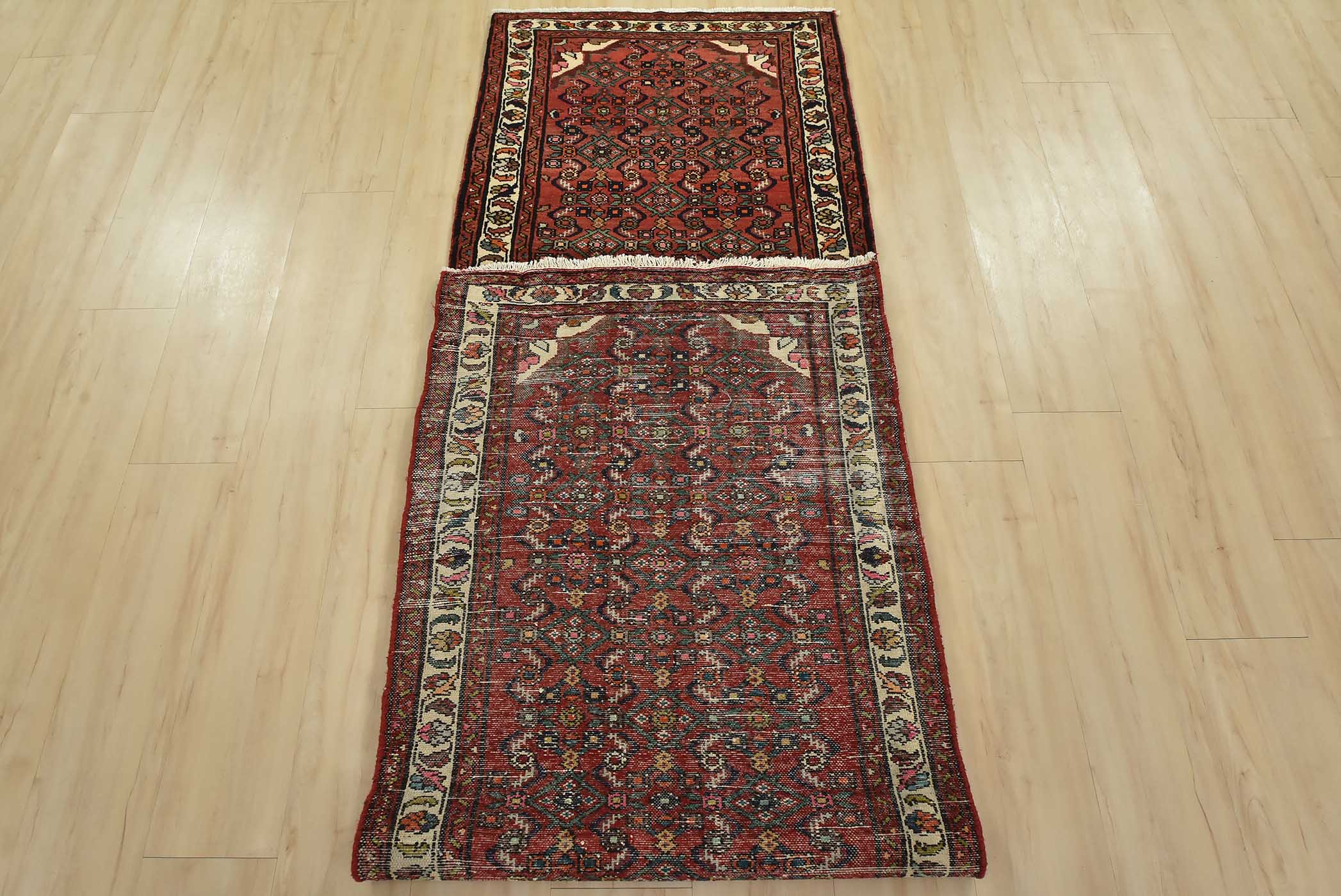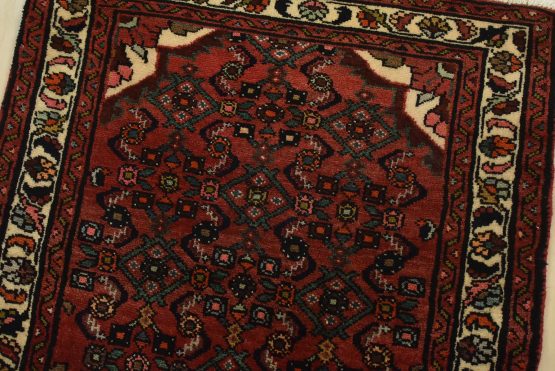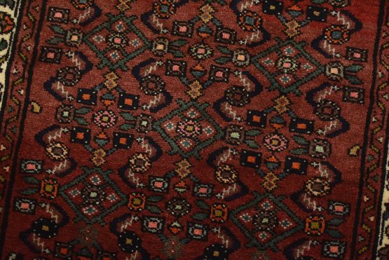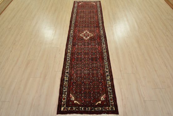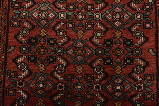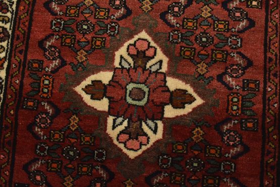 An authentic vintage tribal Hamedan runner hand-knotted with fine wool and natural dyes. This nomadic rug features a central medallion surrounded by a Herati pattern set against a red background. It has a full wool pile with no worn areas and is in very good condition.